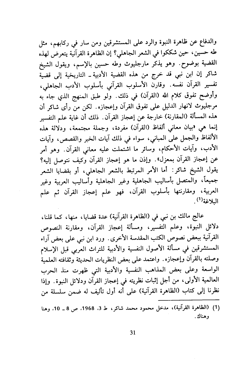 والدفاع عن ظاهرة النبوة والرد على المستشرقين ومن سار في ركابهم، مثل طه حسين، حين شككوا في الشعر الجاهلي؟ إن الظاهرة القرآنية يتعرض لهذه القضية بوضوح. وهو يذكر مارجليوث وطه حسين بالإسم، ويقول الشيخ شاكر إن ابن نبي قد خرج من هذه القضية الأدبية - التاريخية إلى قضية تفسير القرآن نفسه. وقارن الأسلوب القرآني بأسلوب الأدب الجاهلي، وأوضح تفوق كلام الله (القرآن) في ذلك. ولو طبق المنهج الذي جاء به مرجليوث لانهار الدليل على تفوق القرآن وإعجازه. لكن من رأى شاكر أن هذه المسألة (المقارنة) خارجة عن إعجاز القرآن. ذلك أن غاية علم التفسير إنما هي (بيان معاني ألفاظ (القرآن) مفردة، وجملة مجتمعة، ودلالة هذه الألفاظ والجمل على المباني، سواء في ذلك آيات الخبر والقصص، وآيات الأدب، وآيات الأحكام، وسائر ما اشتملت عليه معاني القرآن. وهو أمر عن إعجاز القرآن بمعزل). وإذن ما هو إعجاز القرآن وكيف نتوصل إليه؟ يقول الشيخ شاكر: أما الأمر المرتبط بالشعر الجاهلي، أو بقضايا الشعر جميعا، والمتصل بأساليب الجاهلية وغير الجاهلية وأساليب العربية وغير العربية، ومقارنتها بأسلوب القرآن، فهو علم إعجاز القرآن ثم علم البلاغة (¬1).