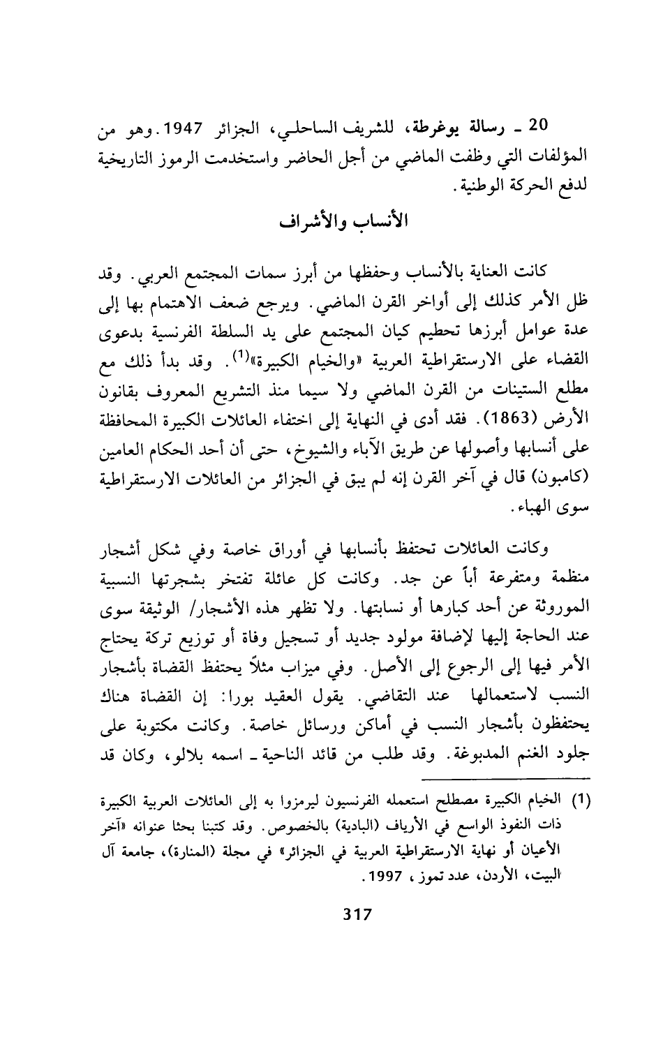 (¬1) الخيام الكبيرة مصطلح استعمله الفرنسيون ليرمزوا به إلى العائلات العربية الكبيرة ذات النفوذ الواسع في الأرياف (البادية) بالخصوص. وقد كتبنا بحثا عنوانه (آخر الأعيان أو نهاية الارستقراطية العربية في الجزائر) في مجلة (المنارة)، جامعة آل البيت، الأردن، عدد تموز، 1997.