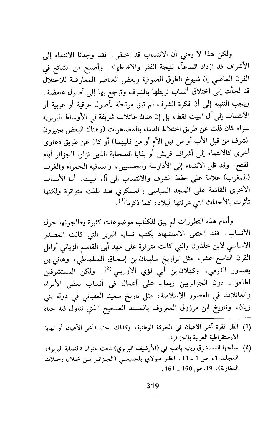 وأمام هذه التطورات لم يبق للكتاب موضوعات كثيرة يعالجونها حول الأنساب. فقد اختفى الاستشهاد بكتب نسابة البربر التي كانت المصدر الأساسي لابن خلدون والتي كانت متوفرة على عهد أبي القاسم الزياني أوائل القرن التاسع عشر، مثل تواريخ سليمان بن إسحاق المطماطي، وهاني بن يصدور القومي، وكهلان بن أبي لؤي الأوربي (¬2). ولكن المستشرقين اطلعوا - دون الجزائريين ربما - على أعمال في أنساب بعض الأمراء والعائلات في العصور الإسلامية، مثل تاريخ سعيد العقباني في دولة بني زيان، وتاريخ ابن مرزوق المعروف بالمسند الصحيح الذي تناول فيه حياة