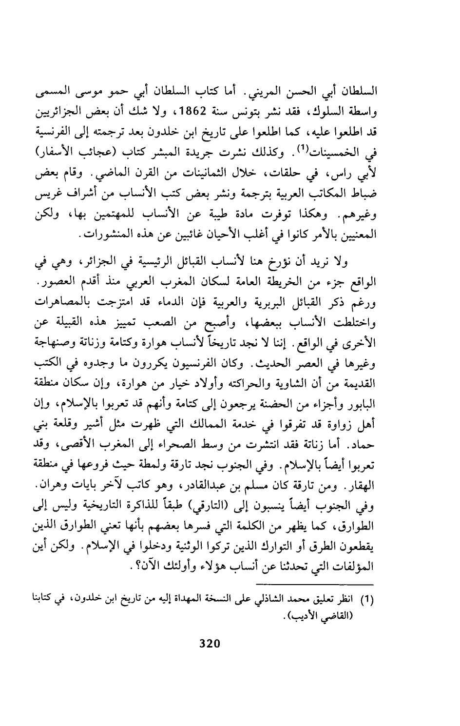 السلطان أبي الحسن المريني. أما كتاب السلطان أبي حمو موسى المسمى واسطة السلوك، فقد نشر بتونس سنة 1862، ولا شك أن بعض الجزائريين قد اطلعوا عليه، كما اطلعوا على تاريخ ابن خلدون بعد ترجمته إلى الفرنسية في الخمسينات (¬1). وكذلك نشرت جريدة المبشر كتاب (عجائب الأسفار) لأبي راس، في حلقات، خلال الثمانينات من القرن الماضي. وقام بعض ضباط المكاتب العربية بترجمة ونشر بعض كتب الأنساب من أشراف غريس وغيرهم. وهكذا توفرت مادة طيبة عن الأنساب للمهتمين بها، ولكن المعنيين بالأمر كانوا في أغلب الأحيان غائبين عن هذه المنشورات.