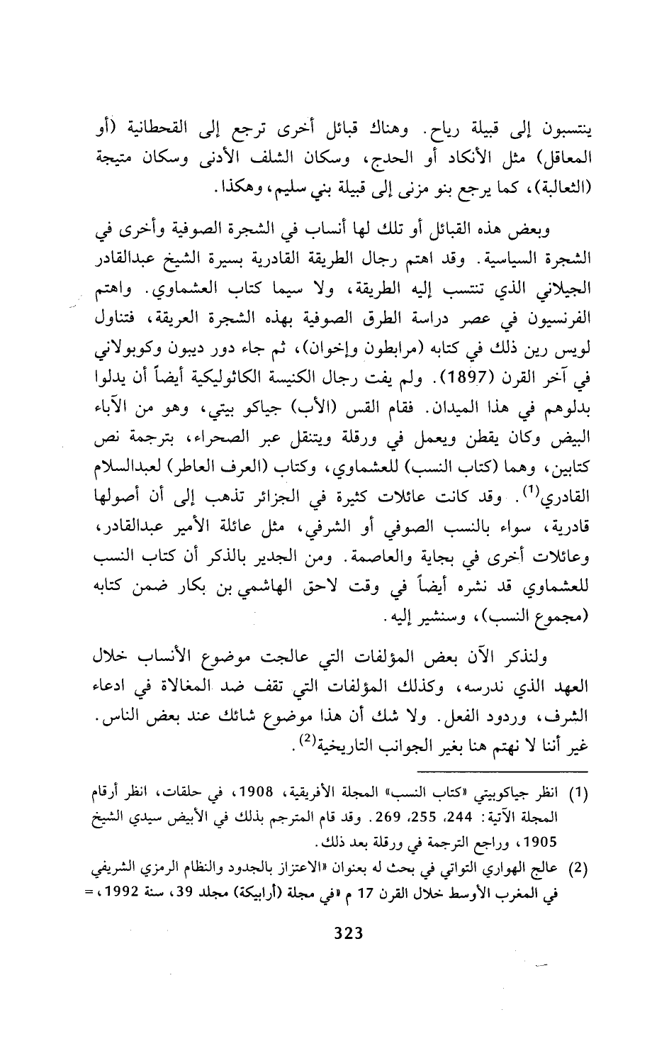 وبعض هذه القبائل أو تلك لها أنساب في الشجرة الصوفية وأخرى في الشجرة السياسية. وقد اهتم رجال الطريقة القادرية بسيرة الشيخ عبد القادر الجيلاني الذي تنتسب إليه الطريقة، ولا سيما كتاب العشماوي. واهتم الفرنسيون في عصر دراسة الطرق الصوفية بهذه الشجرة العريقة، فتناول لويس رين ذلك في كتابه (مرابطون وإخوان)، ثم جاء دور ديبون وكوبولاني في آخر القرن (1897). ولم يفت رجال الكنيسة الكاثوليكية أيضا أن يدلوا بدلوهم في هذا الميدان. فقام القس (الأب) جياكو بيتي، وهو من الآباء البيض وكان يقطن ويعمل في ورقلة ويتنقل عبر الصحراء، بترجمة نص كتابين، وهما (كتاب النسب) للعشماوي، وكتاب (العرف العاطر) لعبد السلام القادري (¬1). وقد كانت عائلات كثيرة في الجزائر تذهب إلى أن أصولها قادرية، سواء بالنسب الصوفي أو الشرفي، مثل عائلة الأمير عبد القادر، وعائلات أخرى في بجاية والعاصمة. ومن الجدير بالذكر أن كتاب النسب للعشماوي قد نشره أيضا في وقت لاحق الهاشمي بن بكار ضمن كتابه (مجموع النسب)، وسنشير إليه.