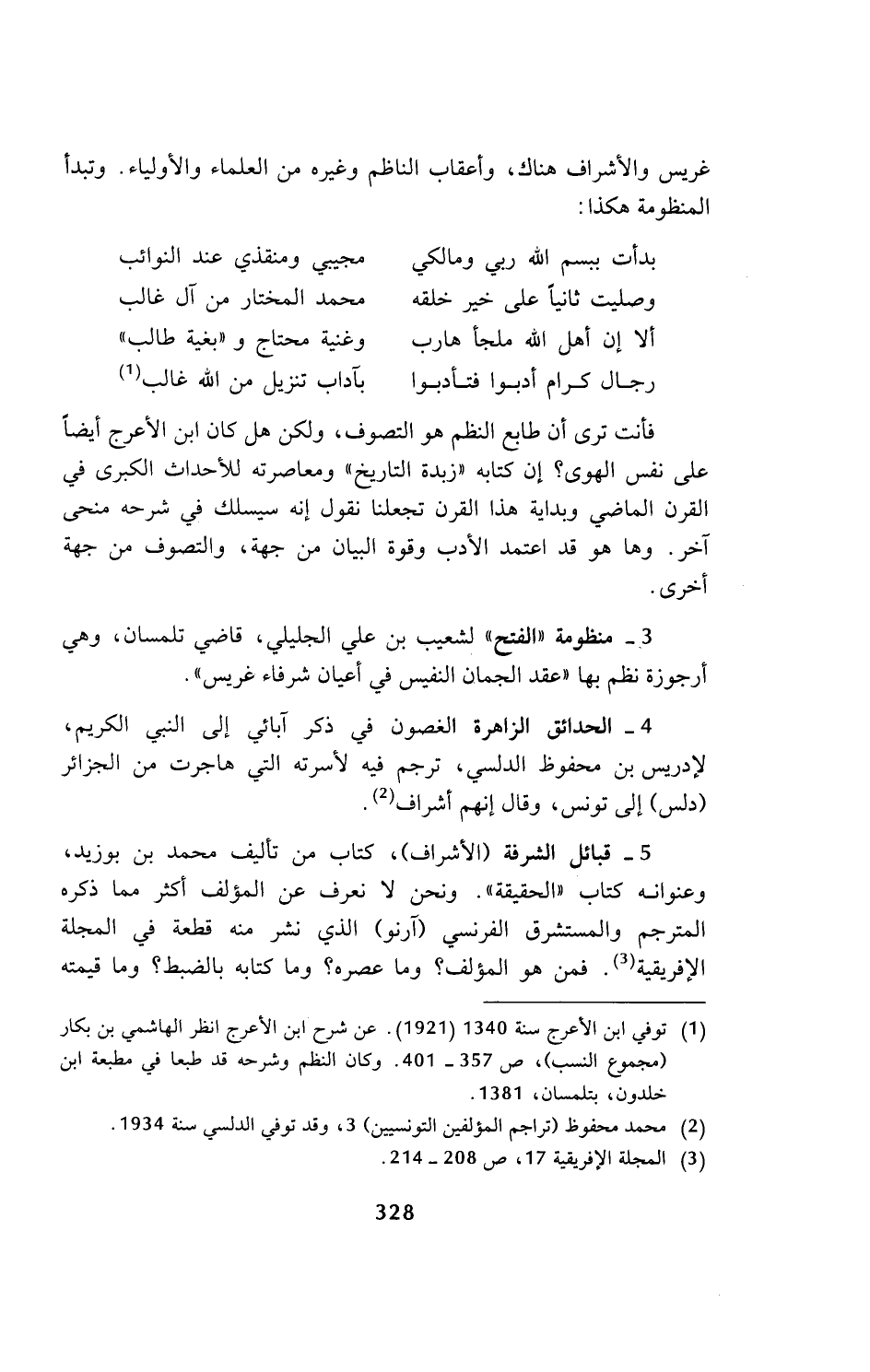 (¬1) توفي ابن الأعرج سنة 1340 (1921). عن شرح ابن الأعرج انظر الهاشمي بن بكار (مجموع النسب)، ص 357 - 401. وكان النظم وشرحه قد طبعا في مطبعة ابن خلدون، بتلمسان، 1381.