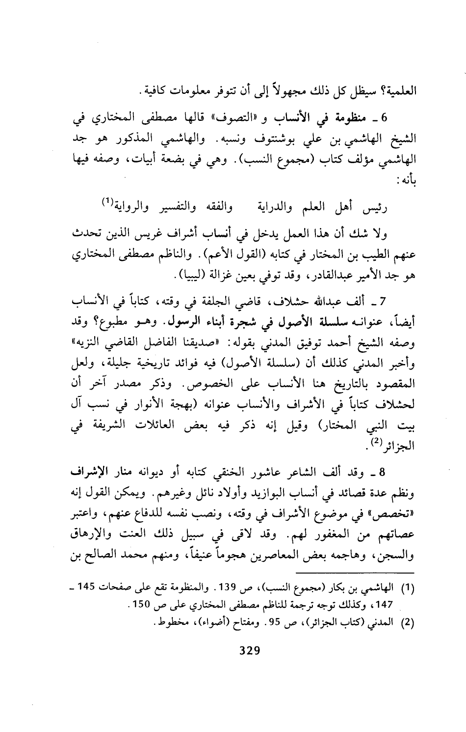 (¬1) الهاشمي بن بكار (مجموع النسب)، ص 139. والمنظومة تقع على صفحات 145 - 147، وكذلك توجد ترجمة للناظم مصطفى المختاري على ص 150.