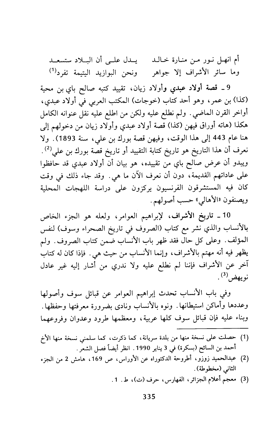10 - تاريخ الأشراف، لإبراهيم العوامر، ولعله هو الجزء الخامس بالأنساب والذي نشر مع كتاب (الصروف في تاريخ الصحراء وسوف) لنفس المؤلف. وعلى كل حال فقد ظهر باب الأنساب ضمن كتاب الصروف. ولم يظهر فيه أنه مهتم بالأشراف، وإنما الأنساب من حيث هي. فإذا كان له كتاب آخر عن الأشراف فإننا لم نطلع عليه ولا ندري من أشار إليه غير عادل نويهض (¬3).