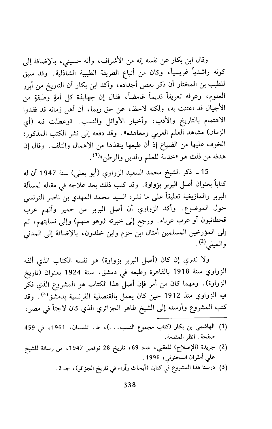15 - ذكر الشيخ محمد السعيد الزواوي (أبو يعلى) سنة 1947 أن له كتابا بعنوان أصل البربر بزواوة. وقد كتب ذلك بعد علاجه في مقاله لمسألة البربر والمازيغية تعليقا على ما نشره السيد محمد المهدي بن ناصر التونسي حول الموضوع. وأكد الزواوي أن أصل البربر من حمير وأنهم عرب قحطانيون أو عرب عرباء. ورجع إلى خبرته (وهو منهم) وإلى نسابتهم، ثم إلى المؤرخين المسلمين أمثال ابن حزم وابن خلدون، بالإضافة إلى المدني والميلي (¬2).