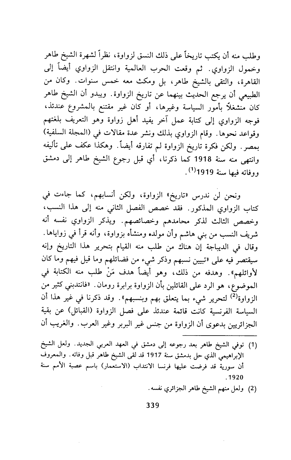 ونحن لن ندرس (تاريخ) الزواوة، ولكن أنسابهم، كما جاءت في كتاب الزواوي المذكور. فقد خصص الفصل الثاني منه إلى هذا النسب، وخصص الثالث لذكر محامدهم وخصائصهم. ويذكر الزواوي نفسه أنه شريف النسب من بني هاشم وأن مولده ومنشأه بزواوة، وأنه قرأ في زواياها. وقال في الديباجة إن هناك من طلب منه القيام بتحرير هذا التاريخ وإنه سيقتصر فيه على (تبيين نسهم وذكر شيء من فضائلهم وما قيل فيهم وما كان لأوائلهم). وهدفه من ذلك، وهو أيضا هدف من طلب منه الكتابة في الموضوع، هو الرد على القائلين بأن الزواوة برابرة رومان. (فانتدبني كثير من الزواوة (¬2) لتحرير شيء بما يتعلق بهم وبنسبهم). وقد ذكرنا في غير هذا أن السياسة الفرنسية كانت قائمة عندئذ على فصل الزواوة (القبائل) عن بقية الجزائريين بدعوى أن الزواوة من جنس غير البربر وغير العرب. والغريب أن