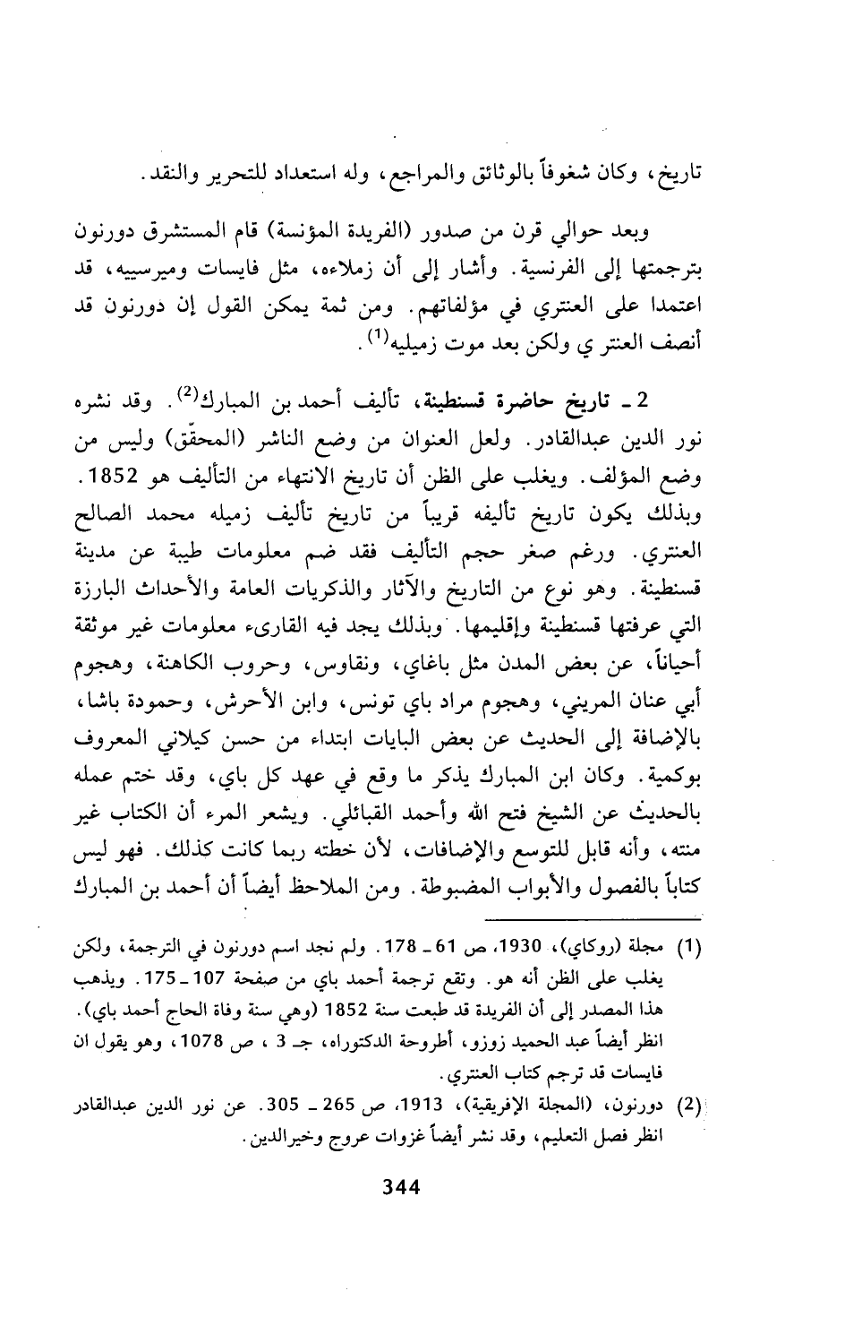 (¬2) دورنون، (المجلة الإفريقية)، 1913، ص 265 - 305. عن نور الدين عبد القادر انظر فصل التعليم، وقد نشر أيضا غزوات عروج وخير الدين.