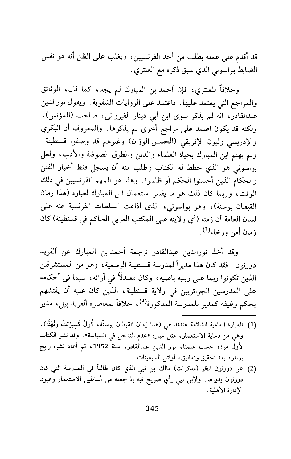 (¬1) العبارة العامية الشائعة عندئذ هي (هذا زمان القبطان بوسنة، كول كسيرتك وتهنة). وهي من دعاية الاستعمار، مثل عبارة (عدم التدخل في السياسة). وقد نشر الكتاب لأول مرة، حسب علمنا، نور الدين عبد القادر، سنة 1952، ثم أعاد نشره رابح بونار، بعد تحقيق وتعاليق، أوائل السبعينات.