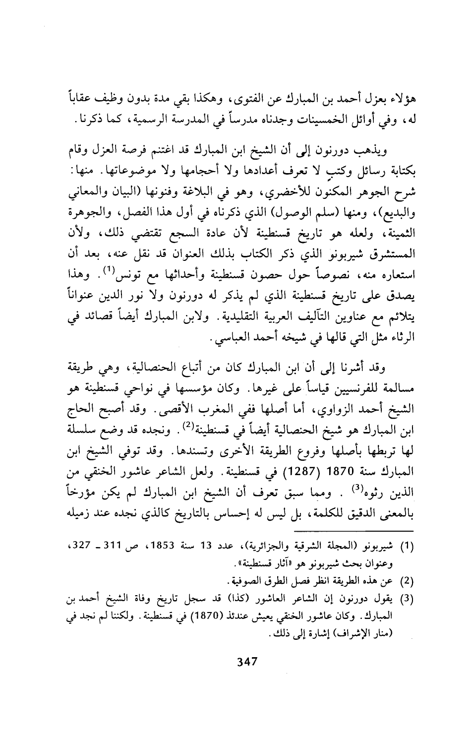 (¬3) يقول دورنون إن الشاعر العاشور (كذا) قد سجل تاريخ وفاة الشيخ أحمد بن المبارك. وكان عاشور الخنقي يعيش عندئذ (1870) في قسنطينة. ولكننا لم نجد في (منار الإشراف) إشارة إلى ذلك.