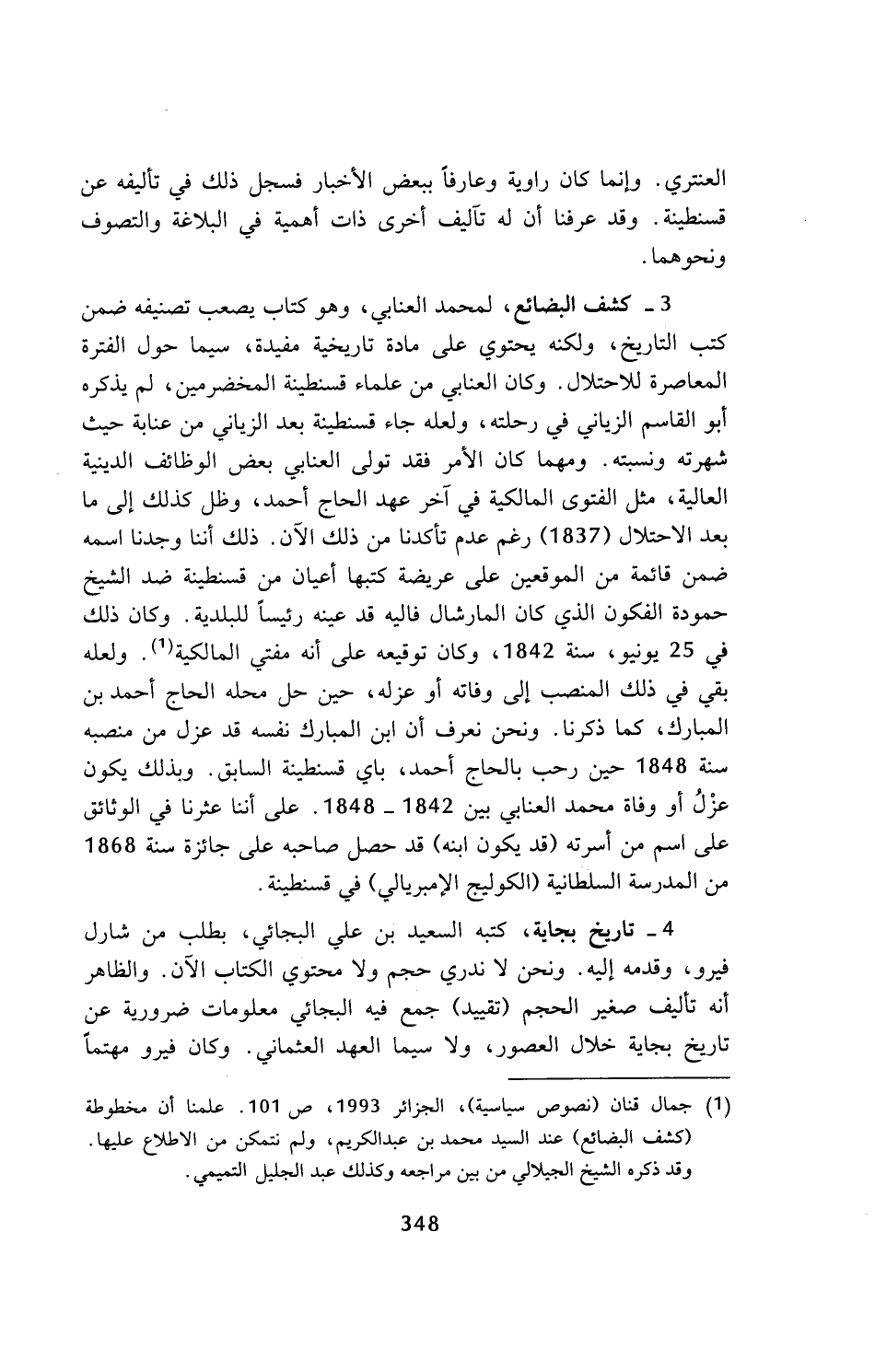 3 - كشف البضائع، لمحمد العنابي، وهو كتاب يصعب تصنيفه ضمن كتب التاريخ، ولكنه يحتوي على مادة تاريخية مفيدة، سيما حول الفترة المعاصرة للاحتلال. وكان العنابي من علماء قسنطينة المخضرمين، لم يذكره أبو القاسم الزياني في رحلته، ولعله جاء قسنطينة بعد الزياني من عنابة حيث شهرته ونسبته. ومهما كان الأمر فقد تولى العنابي بعض الوظائف الدينية العالية، مثل الفتوى المالكية في آخر عهد الحاج أحمد، وظل كذلك إلى ما بعد الاحتلال (1837) رغم عدم تأكدنا من ذلك الآن. ذلك أننا وجدنا اسمه ضمن قائمة من الموقعين على عريضة كتبها أعيان من قسنطينة ضد الشيخ حمودة الفكون الذي كان المارشال فاليه قد عينه رئيسا للبلدية. وكان ذلك في 25 يونيو، سنة 1842، وكان توقيعه على أنه مفتي المالكية (¬1). ولعله بقي في ذلك المنصب إلى وفاته أو عزله، حين حل محله الحاج أحمد بن المبارك، كما ذكرنا. ونحن نعرف أن ابن المبارك نفسه قد عزل من منصبه سنة 1848 حين رحب بالحاج أحمد، باي قسنطينة السابق. وبذلك يكون عزلة أو وفاة محمد العنابي بين 1842 - 1848. على أننا عثرنا في الوثائق على اسم من أسرته (قد يكون ابنه) قد حصل صاحبه على جائزة سنة 1868 من المدرسة السلطانية (الكوليج الإمبريالي) في قسنطينة.