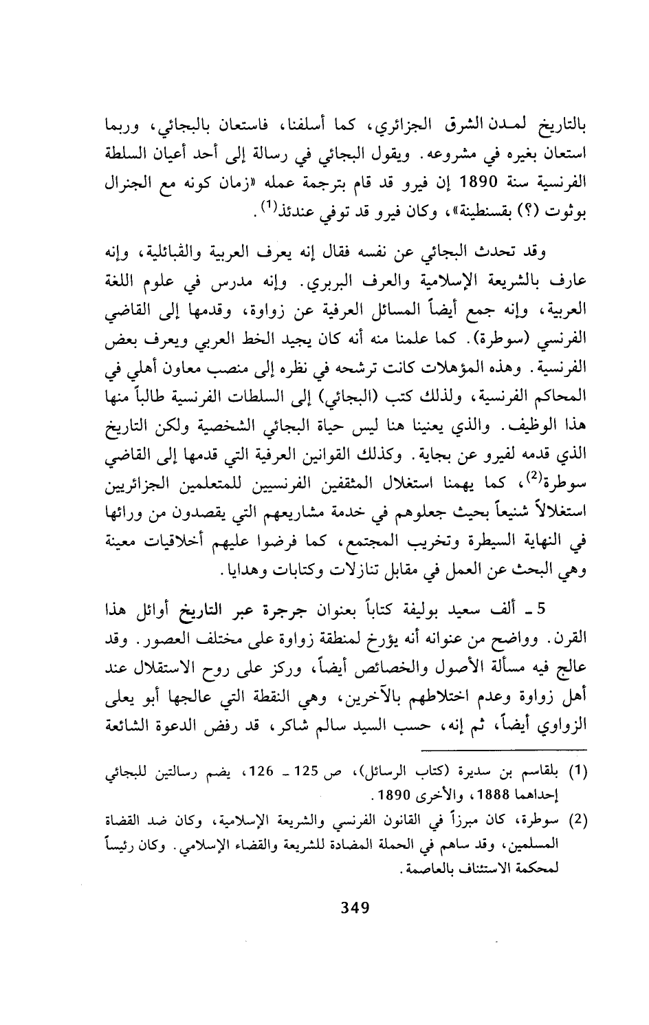 بالتاريخ لمدن الشرق الجزائري، كما أسلفنا، فاستعان بالبجائي، وربما استعان بغيره في مشروعه. ويقول البجائي في رسالة إلى أحد أعيان السلطة الفرنسية سنة 1890 إن فيرو قد قام بترجمة عمله (زمان كونه مع الجنرال بوثوت (؟) بقسنطينة)، وكان فيرو قد توفي عندئذ (¬1).