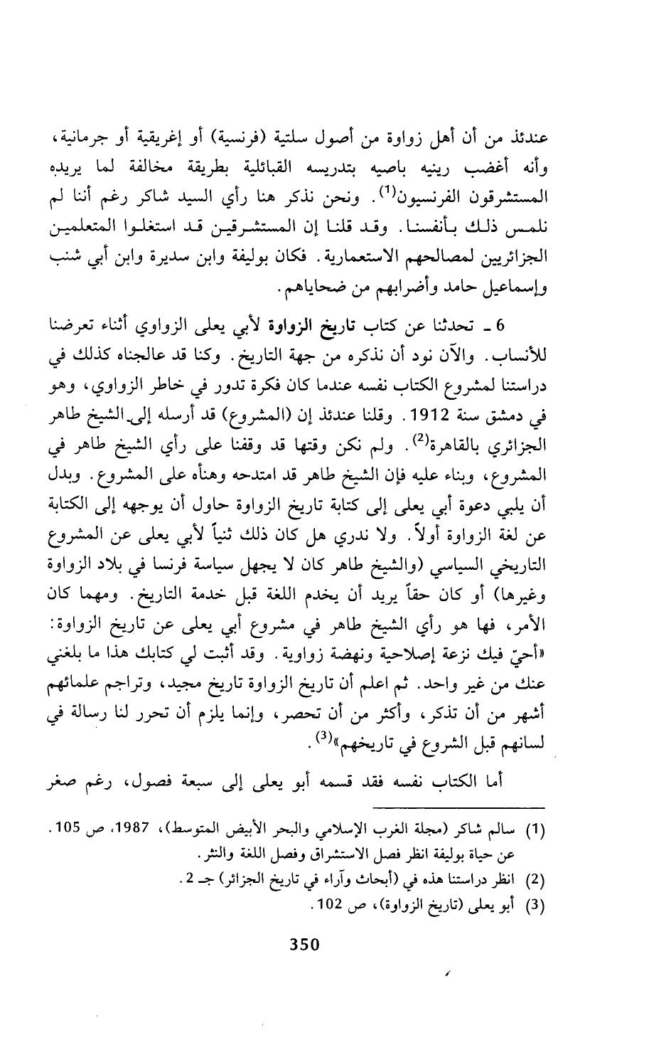 6 - تحدثنا عن كتاب تاريخ الزواوة لأبي يعلى الزواوي أثناء تعرضنا للأنساب. والآن نود أن نذكره من جهة التاريخ. وكنا قد عالجناه كذلك في دراستنا لمشروع الكتاب نفسه عندما كان فكرة تدور في خاطر الزواوي، وهو في دمشق سنة 1912. وقلنا عندئذ إن (المشروع) قد أرسله إلى الشيخ طاهر الجزائري بالقاهرة (¬2). ولم نكن وقتها قد وقفنا على رأي الشيخ طاهر في المشروع، وبناء عليه فإن الشيخ طاهر قد امتدحه وهنأه على المشروع. وبدل أن يلبي دعوة أبي يعلى إلى كتابة تاريخ الزواوة حاول أن يوجهه إلى الكتابة عن لغة الزواوة أولا. ولا ندري هل كان ذلك ثنيا لأبي يعلى عن المشروع التاريخي السياسي (والشيخ طاهر كان لا يجهل سياسة فرنسا في بلاد الزواوة وغيرها) أو كان حقا يريد أن يخدم اللغة قبل خدمة التاريخ. ومهما كان الأمر، فها هو رأي الشيخ طاهر في مشروع أبي يعلى عن تاريخ الزواوة: (أحي فيك نزعة إصلاحية ونهضة زواوية. وقد أثبت لي كتابك هذا ما بلغني عنك من غير واحد. ثم اعلم أن تاريخ الزواوة تاريخ مجيد، وتراجم علمائهم أشهر من أن تذكر، وأكثر من أن تحصر، وإنما يلزم أن تحرر لنا رسالة في لسانهم قبل الشروع في تاريخهم) (¬3).