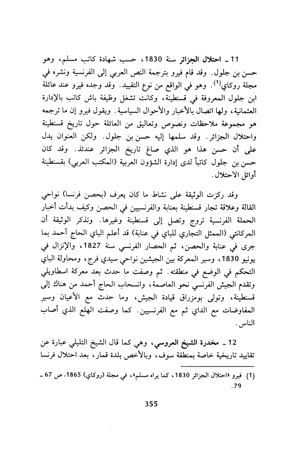 11 - احتلال الجزائر سنة 1830، حسب شهادة كاتب مسلم، وهو حسن بن جلول. وقد قام فيرو بترجمة النص العربي إلى الفرنسية ونشره في مجلة روكاي (¬1). وهو في الواقع من نوع التقييد. وقد وجده فيرو عند عائلة ابن جلول المعروفة في قسنطينة، وكانت تشغل وظيفة باش كاتب بالإدارة العثمانية، ولها اتصال بالأخبار والأحوال السياسية. ويقول فيرو إن ما ترجمه هو مجموعة ملاحظات ونصوص وتعاليق من العائلة حول تاريخ قسنطينة واحتلال الجزائر. وقد سلمها إليه حسن بن جلول. ولكن العنوان يدل على أن حسن هذا هو الذي صاغ تاريخ الجزائر عندئذ. وقد كان حسن بن جلول كاتبا لدى إدارة الشؤون العربية (المكتب العربي) بقسنطينة أوائل الاحتلال.