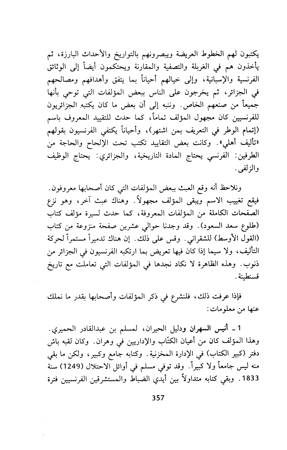 1 - أنيس السهران ودليل الحيران، لمسلم بن عبد القادر الحميري. وهذا المؤلف كان من أعيان الكتاب والإداريين في وهران. وكان لقبه باش دفتر (كبير الكتاب) في الإدارة المخزنية. وكتابه جامع وكبير، ولكن ما بقي منه ليس جامعا ولا كبيرا. وقد توفي مسلم في أوائل الاحتلال (1249) سنة 1833. وبقي كتابه متداولا بين أيدي الضباط والمستشرقين الفرنسيين فترة