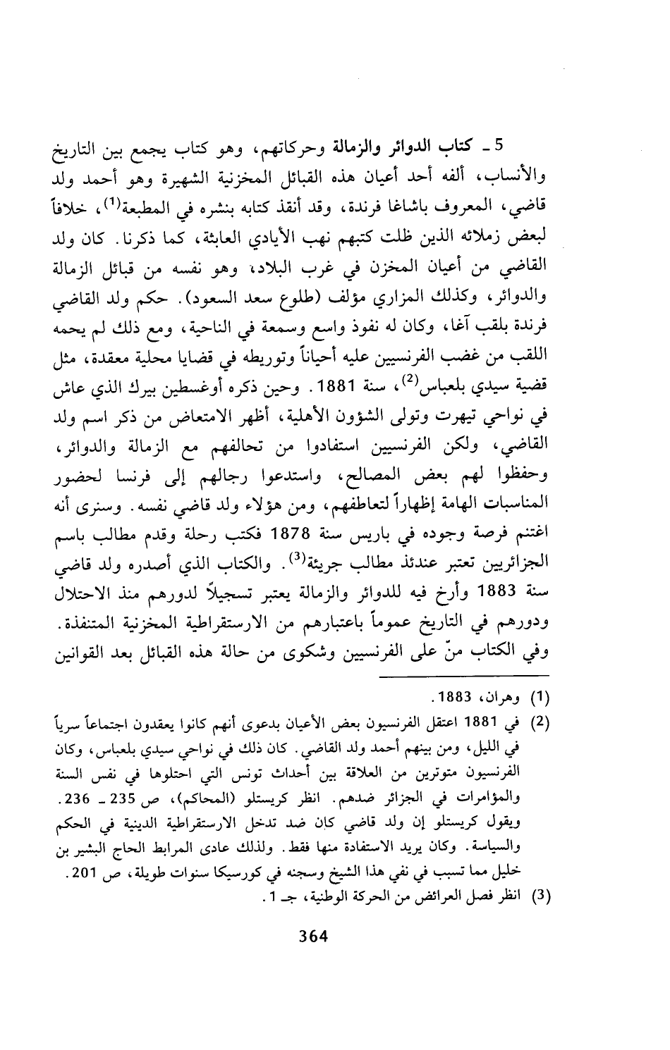 5 - كتاب الدوائر والزمالة وحركاتهم، وهو كتاب يجمع بين التاريخ والأنساب، ألفه أحد أعيان هذه القبائل المنخزنية الشهيرة وهو أحمد ولد قاضي، المعروف باشاغا فرندة، وقد أنقذ كتابه بنشره في المطبعة (¬1)، خلافا لبعض زملائه الذين ظلت كتبهم نهب الأيادي العابثة، كما ذكرنا. كان ولد القاضي من أعيان المخزن في غرب البلاد، وهو نفسه من قبائل الزمالة والدوائر، وكذلك المزاري مؤلف (طلوع سعد السعود). حكم ولد القاضي فرندة بلقب آغا، وكان له نفوذ واسع وسمعة في الناحية، ومع ذلك لم يحمه اللقب من غضب الفرنسيين عليه أحيانا وتوريطه في قضايا محلية معقدة، مثل قضية سيدي بلعباس (¬2)، سنة 1881. وحين ذكره أوغسطين بيرك الذي عاش في نواحي تيهرت وتولى الشؤون الأهلية، أظهر الامتعاض من ذكر اسم ولد القاضي، ولكن الفرنسيين استفادوا من تحالفهم مع الزمالة والدوائر، وحفظوا لهم بعض المصالح، واستدعوا رجالهم إلى فرنسا لحضور المناسبات الهامة إظهارا لتعاطفهم، ومن هؤلاء ولد قاضي نفسه. وسنرى أنه اغتنم فرصة وجوده في باريس سنة 1878 فكتب رحلة وقدم مطالب باسم الجزائريين تعتبر عندئذ مطالب جريئة (¬3). والكتاب الذي أصدره ولد قاضي سنة 1883 وأرخ فيه للدوائر والزمالة يعتبر تسجيلا لدورهم منذ الاحتلال ودورهم في التاريخ عموما باعتبارهم من الارستقراطية المخزنية المتنفذة. وفي الكتاب من على الفرنسيين وشكوى من حالة هذه القبائل بعد القوانين