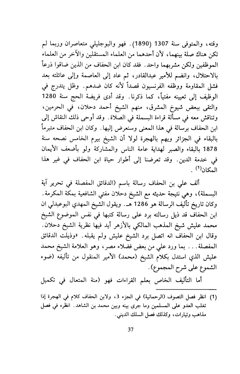 وقته، والمتوفى سنة 1307 (1890). فهو والبوجليلي متعاصران وربما لم تكن هناك صلة بينهما، لأن أحدهما من العلماء المستقلين والآخر من العلماء الموظفين ولكن مشربهما واحد. فقد كان ابن الحفاف من الذين ضاقوا ذرعا بالاحتلال، وانضم للأمير عبد القادر، ثم عاد إلى العاصمة وإلى عائلته بعد فشل المقاومة ووظفه الفرنسيون قصدا لأنه كان ضدهم. وظل يتدرج في الوظيف إلى تعيينه مفتيا، كما ذكرنا. وقد أدى فريضة الحج سنة 1280 والتقى ببعض شيوخ المشرق، منهم الشيخ أحمد دحلان، في الحرمين، وتناقش معه في مسألة قراءة البسملة في الصلاة. وقد أوحى ذلك النقاش إلى ابن الحفاف برسالة في هذا المعنى وسنعرض إليها. وكان ابن الحفاف متبرما بالبقاء في الجزائر ويهم بالهجرة لولا أن الشيخ بيرم الخامس نصحه سنة 1878 بالبقاء والصبر لهداية عامة الناس والمشاركة ولو بأضعف الإيمان في خدمة الدين. وقد تعرضنا إلى أطوار حياة ابن الحفاف في غير هذا المكان (¬1).