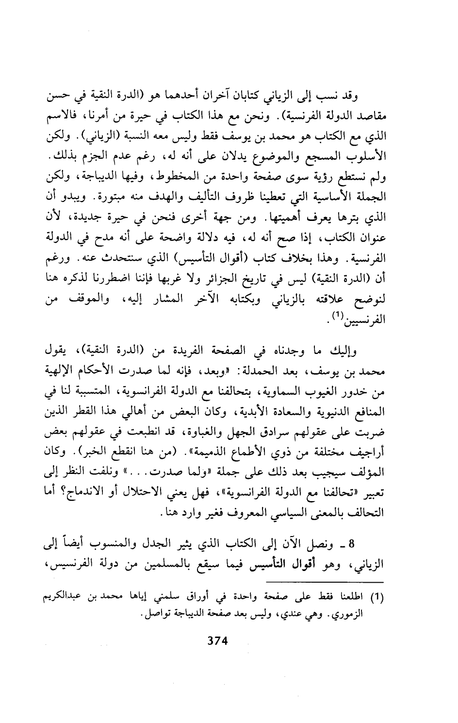 8 - ونصل الآن إلى الكتاب الذي يثير الجدل والمنسوب أيضا إلى الزياني، وهو أقوال التأسيس فيما سيقع بالمسلمين من دولة الفرنسيس،