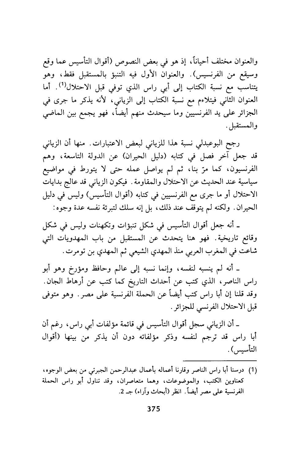 والعنوان مختلف أحيانا، إذ هو في بعض النصوص (أقوال التأسيس عما وقع وسيقع من الفرنسيس). والعنوان الأول فيه التنبؤ بالمستقبل فقط، وهو يتناسب مع نسبة الكتاب إلى أبي راس الذي توفي قبل الاحتلال (¬1). أما العنوان الثاني فيتلاءم مع نسبة الكتاب إلى الزياني، لأنه يذكر ما جرى في الجزائر على يد الفرنسيين وما سيحدث منهم أيضا، فهو يجمع بين الماضي والمستقبل.
