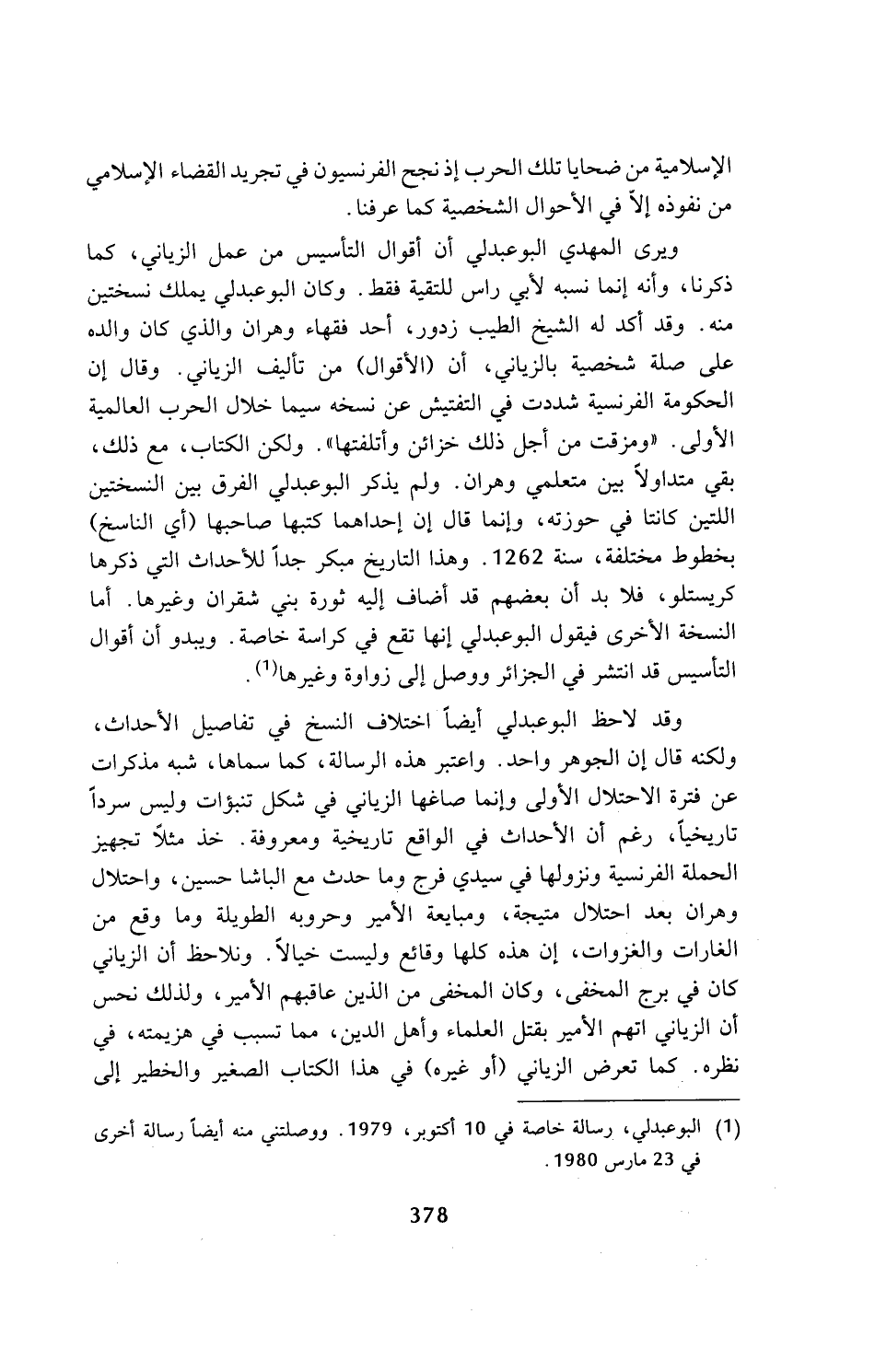 وقد لاحظ البوعبدلي أيضا اختلاف النسخ في تفاصيل الأحداث، ولكنه قال إن الجوهر واحد. واعتبر هذه الرسالة، كما سماها، شبه مذكرات عن فترة الاحتلال الأولى وإنما صاغها الزياني في شكل تنبؤات وليس سردا تاريخيا، رغم أن الأحداث في الواقع تاريخية ومعروفة. خذ مثلا تجهيز الحملة الفرنسية ونزولها في سيدي فرج وما حدث مع الباشا حسين، واحتلال وهران بعد احتلال متيجة، ومبايعة الأمير وحروبه الطويلة وما وقع من الغارات والغزوات، إن هذه كلها وقائع وليست خيالا. ونلاحظ أن الزياني كان في برج المخفى، وكان المخفى من الذين عاقبهم الأمير، ولذلك نحس أن الزياني اتهم الأمير بقتل العلماء وأهل الدين، مما تسبب في هزيمته، في نظره. كما تعرض الزيانى (أو غيره) فى هذا الكتاب الصغير والخطير إلى