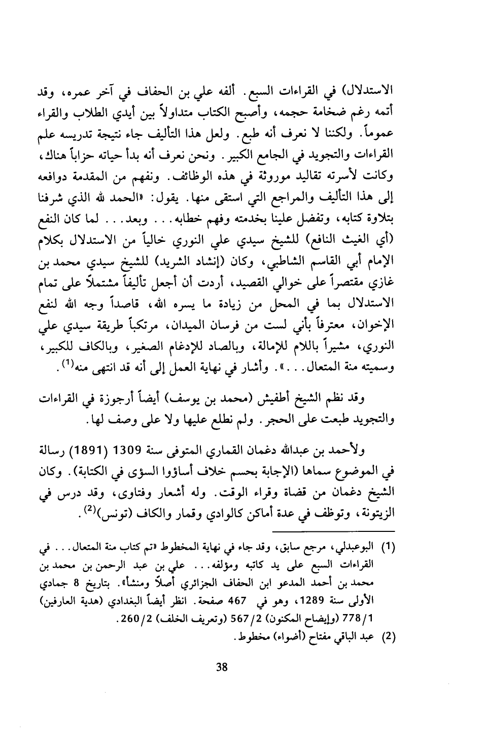 (¬1) البوعبدلي، مرجع سابق، وقد جاء في نهاية المخطوط (تم كتاب منة المتعال ... في القراءات السبع على يد كاتبه ومؤلفه ... علي بن عبد الرحمن بن محمد بن محمد بن أحمد المدعو ابن الحفاف الجزائري أصلا ومنشأ). بتاريخ 8 جمادي الأولى سنة 1289، وهو في 467 صفحة. انظر أيضا البغدادي (هدية العارفين) 1/ 778 (وإيضاح المكنون) 2/ 567 (وتعريف الخلف) 2/ 260.
