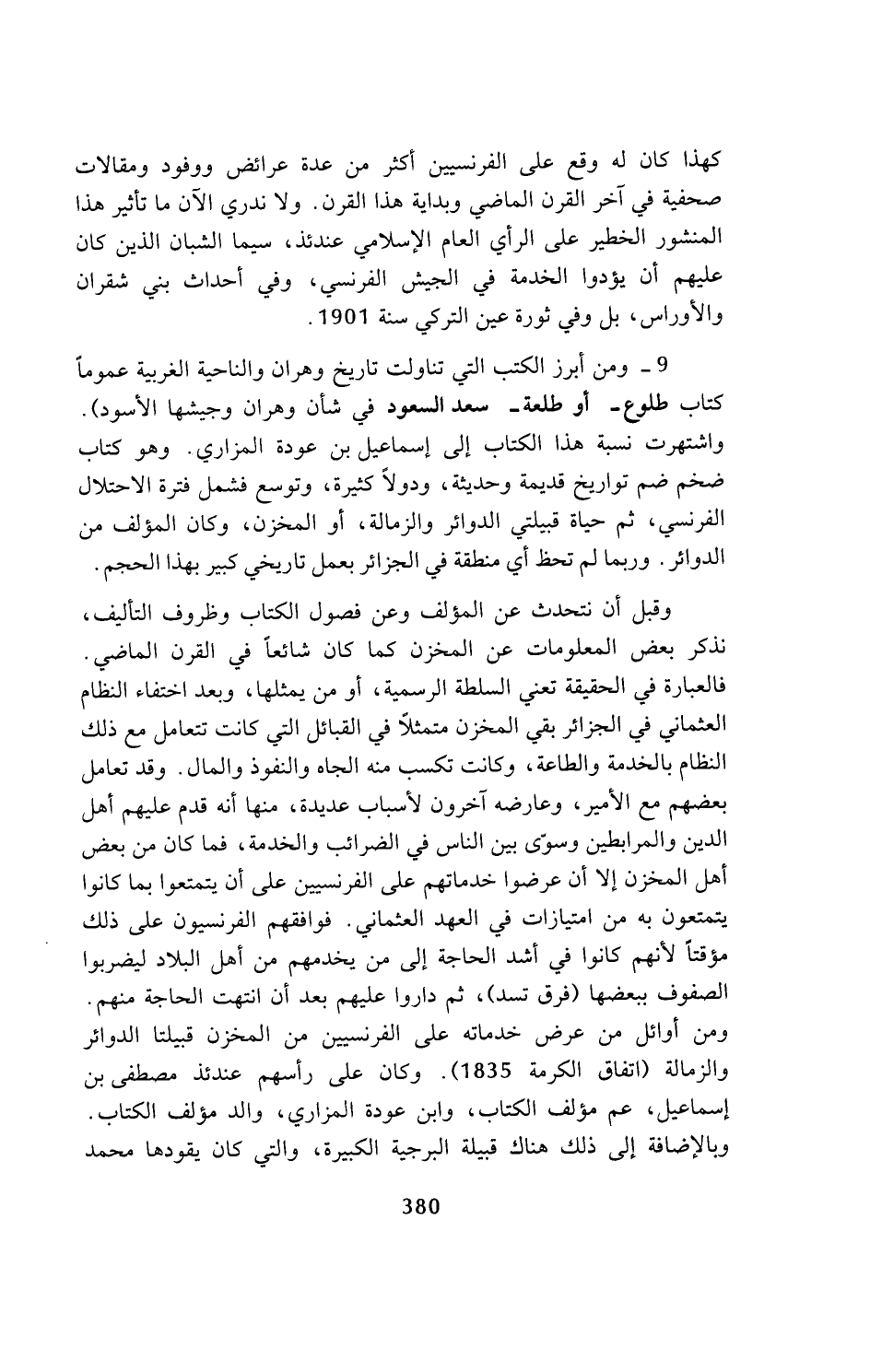 9 - ومن أبرز الكتب التي تناولت تاريخ وهران والناحية الغربية عموما كتاب (طلوع - أو طلعة - سعد السعود في شأن وهران وجيشها الأسود). واشتهرت نسبة هذا الكتاب إلى إسماعيل بن عودة المزاري. وهو كتاب ضخم ضم تواريخ قديمة وحديثة، ودولا كثيرة، وتوسع فشمل فترة الاحتلال الفرنسي، ثم حياة قبيلتي الدوائر والزمالة، أو المخزن، وكان المؤلف من الدوائر. وربما لم تحظ أي منطقة في الجزائر بعمل تاريخي كبير بهذا الحجم.