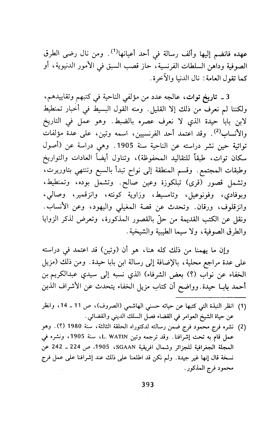 3 - تاريخ توات، عالجه عدد من مؤلفي الناحية في كتبهم وتقاييدهم، ولكننا لم نعرف من ذلك إلا القليل. ومنه القول البسيط في أحبار تمنطيط لابن بابا حيدة الذي لا نعرف عصره بالضبط. وهو عمل في التاريخ والأنساب (¬2). وقد اعتمد أحد الفرنسيين، اسمه وتين، على عدة مؤلفات تواتية حين نشر دراسته عن الناحية سنة 1905. وهي دراسة عن (أصول سكان توات، طبقا للتقاليد المحفوظة)، وتناول أيضا العادات والتواريخ وطبقات المجتمع. وقسم المنطقة إلى نواح تبدأ بالسبع وتنتهي بتاوريرت، وتشمل قصور (قرى) تبلكوزة وعين صالح. وتشمل بوده، وتمنطيط، وبوفادي، وفونوعيل، وتامسيط، وزاوية كونته، وانزقمير، وصالي، وانزقلوف، ورقان. وتحدت عن قصة المغيلي واليهود، وعن الأنساب. ونقل عن الكتب القديمة من حل بالقصور المذكورة، وتعرض لذكر الزوايا والطرق الصوفية، ولا سيما الطيبية والشيخية.