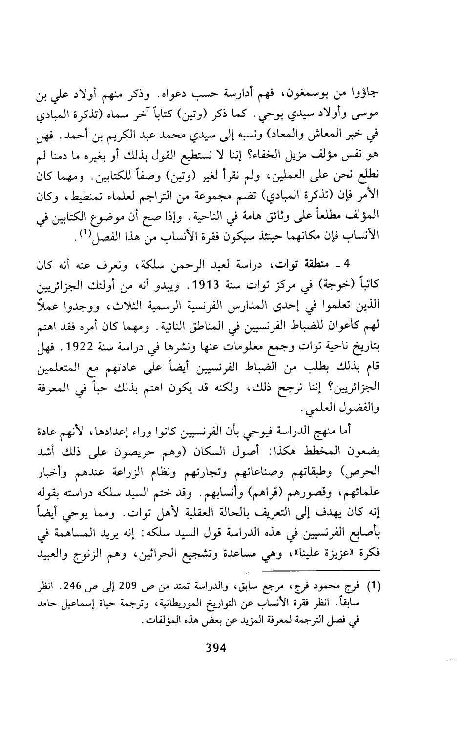 جاؤوا من بوسمغون، فهم أدارسة حسب دعواه. وذكر منهم أولاد علي بن موسى وأولاد سيدي بوحي. كما ذكر (وتين) كتابا آخر سماه (تذكرة المبادي في خبر المعاش والمعاد) ونسبه إلى سيدي محمد عبد الكريم بن أحمد. فهل هو نفس مؤلف مزيل الخفاء؟ إننا لا نستطيع القول بذلك أو بغيره ما دمنا لم نطلع نحن على العملين، ولم نقرأ لغير (وتين) وصفا للكتابين. ومهما كان الأمر فإن (تذكرة المبادي) تضم مجموعة من التراجم لعلماء تمنطيط، وكان المؤلف مطلعا على وثائق هامة في الناحية. وإذا صح أن موضوع الكتابين في الأنساب فإن مكانهما حينئذ سيكون فقرة الأنساب من هذا الفصل (¬1).