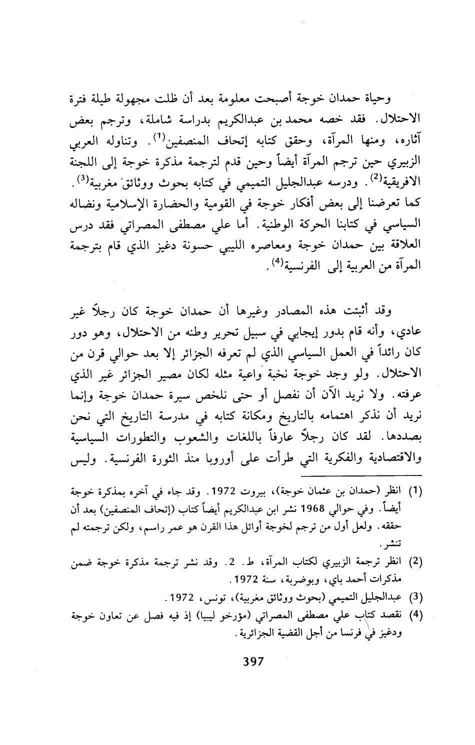 (¬1) انظر (حمدان بن عثمان خوجة)، بيروت 1972. وقد جاء في آخره بمذكرة خوجة أيضا. وفي حوالي 1968 نشر ابن عبد الكريم أيضا كتاب (إتحاف المنصفين) بعد أن حققه. ولعل أول من ترجم لخوجة أوائل هذا القرن هو عمر راسم، ولكن ترجمته لم تنشر.
