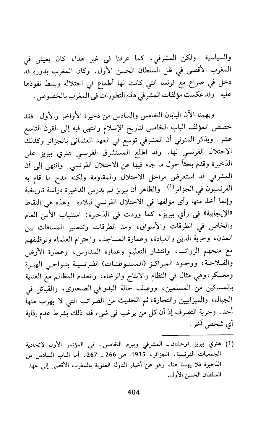 ويهمنا الآن البابان الخامس والسادس من ذخيرة الأواخر والأول. فقد خصص المؤلف الباب الخامس لتاريخ الإسلام وانتهى فيه إلى القرن التاسع عشر. ويذكر المنوني أن المشرفي توسع في العهد العثماني بالجزائر وكذلك الاحتلال الفرنسي لها. وقد اطلع المستشرق الفرنسي هنري بيريز على الذخيرة وقدم بحثا حول ما جاء فيها عن الاحتلال الفرنسي. وانتهى إلى أن المشرفي قد استعرض مراحل الاحتلال والمقاومة ولكنه مدح ما قام به الفرنسيون في الجزائر (¬1). والظاهر أن بيريز لم يدرس الذخيرة دراسة تاريخية وإنما أخذ منها رأي مؤلفها في الاحتلال الفرنسي لبلاده. وهذه هي النقاط (الإيجابية) في رأي بيريز، كما وردت في الذخيرة: استتباب الأمن العام والخاص في الطرقات والأسواق، ومد الطرقات وتقصير المسافات بين المدن، وحرية الدين والعبادة، وعمارة المساجد، واحترام العلماء وتوظيفهم مع منحهم الرواتب، وانتشار التعليم وعمارة المدارس، وعمارة الأرض والفلاحة، ووجود المراكز (المستوطنات) الفرنسية بنواحي الهبرة ومعسكر، وهي مثال في النظام والانتاج والرخاء، وانعدام المظالم مع العناية بالمساكين من المسلمين، ووصف حالة البدو في الصحارى، والقبائل في الجبال، والميزابيين والتجارة، ثم الحديث عن الضرائب التي لا يهرب منها أحد. وحرية التصرف إذ أن كل من يرغب في شيء فله ذلك بشرط عدم إذاية أي شخص آخر.