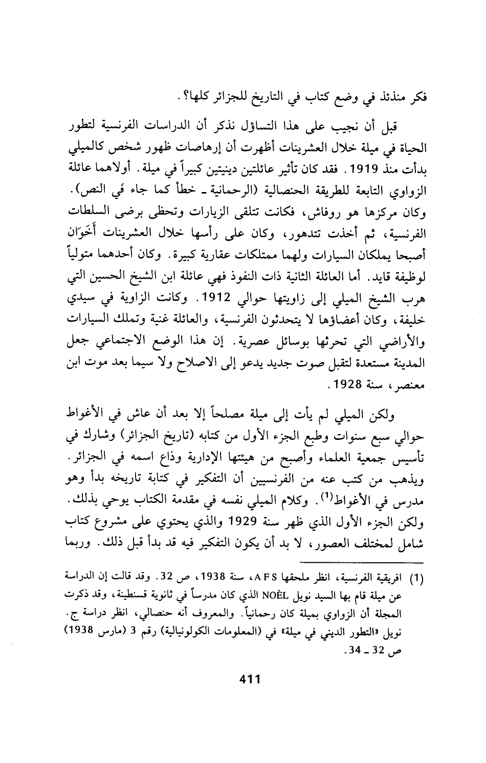 (¬1) افريقية الفرنسية، انظر ملحقها AFS، سنة 1938، ص 32. وقد قالت إن الدراسة عن ميلة قام بها السيد نويل NOEL الذي كان مدرسا في ثانوية قسنطينة، وقد ذكرت المجلة أن الزواوي بميلة كان رحمانيا. والمعروف أنه حنصالي، انظر دراسة ج. نويل (التطور الديني في ميلة) في (المعلومات الكولونيالية) رقم 3 (مارس 1938) ص 32 - 34.