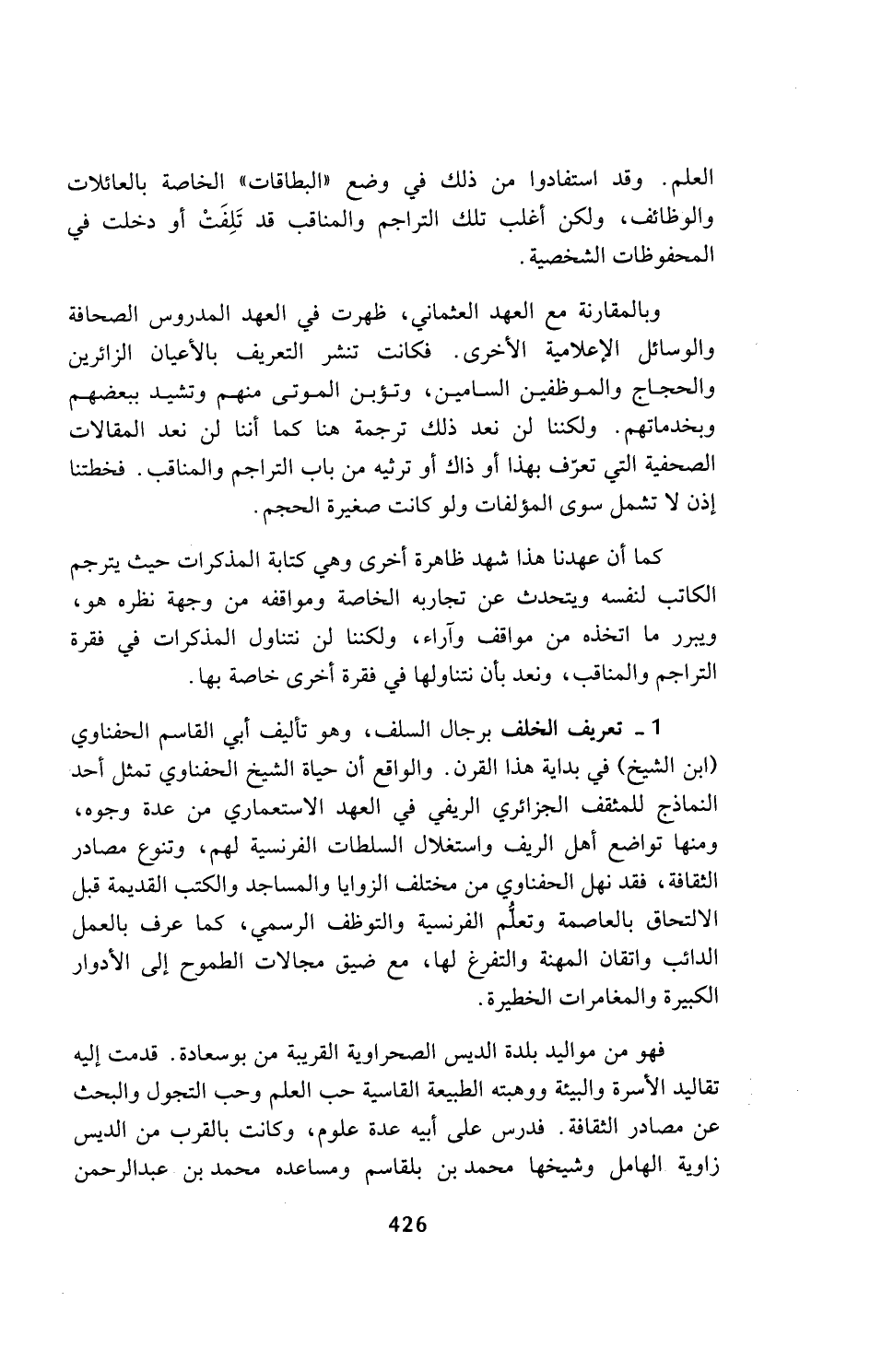 1 - تعريف الخلف برجال السلف، وهو تأليف أبي القاسم الحفناوي (ابن الشيخ) في بداية هذا القرن. والواقع أن حياة الشيخ الحفناوي تمثل أحد النماذج للمثقف الجزائري الريفي في العهد الاستعماري من عدة وجوه، ومنها تواضع أهل الريف واستغلال السلطات الفرنسية لهم، وتنوع مصادر الثقافة، فقد نهل الحفناوي من مختلف الزوايا والمساجد والكتب القديمة قبل الالتحاق بالعاصمة وتعلم الفرنسية والتوظف الرسمي، كما عرف بالعمل الدائب واتقان المهنة والتفرغ لها، مع ضيق مجالات الطموح إلى الأدوار الكبيرة والمغامرات الخطيرة.