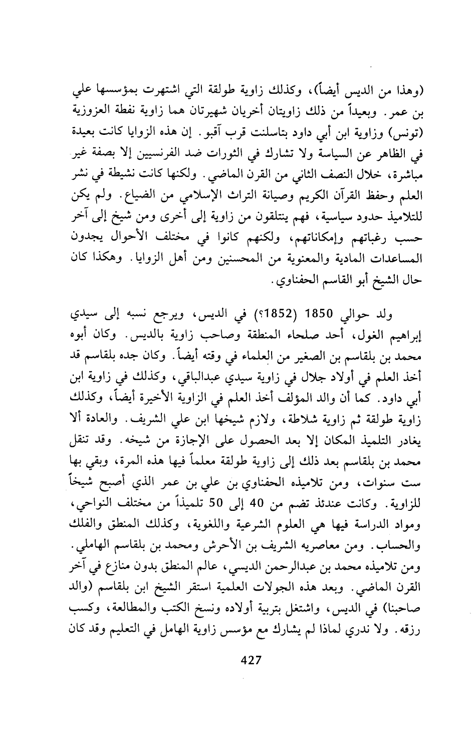 (وهذا من الديس أيضا)، وكذلك زاوية طولقة التي اشتهرت بمؤسسها علي بن عمر. وبعيدا من ذلك زاويتان أخريان شهيرتان هما زاوية نفطة العزوزية (تونس) وزاوية ابن أبي داود بتاسلنت قرب آقبو. إن هذه الزوايا كانت بعيدة في الظاهر عن السياسة ولا تشارك في الثورات ضد الفرنسيين إلا بصفة غير مباشرة، خلال النصف الثاني من القرن الماضي. ولكنها كانت نشيطة في نشر العلم وحفظ القرآن الكريم وصيانة التراث الإسلامي من الضياع. ولم يكن للتلاميذ حدود سياسية، فهم ينتلقون من زاوية إلى أخرى ومن شيخ إلى آخر حسب رغباتهم وإمكاناتهم، ولكنهم كانوا في مختلف الأحوال يجدون المساعدات المادية والمعنوية من المحسنين ومن أهل الزوايا. وهكذا كان حال الشيخ أبو القاسم الحفناوي.