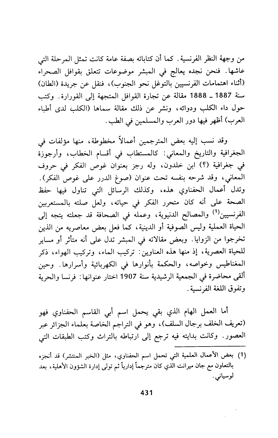 (¬1) بعض الأعمال العلمية التي تحمل اسم الحفناوي، مثل (الخبر المنتشر) قد أنجزه بالتعاون مع جان ميرانت الذي كان مترجما إداريا ثم تولى إدارة الشؤون الأهلية، بعد لوسياني.