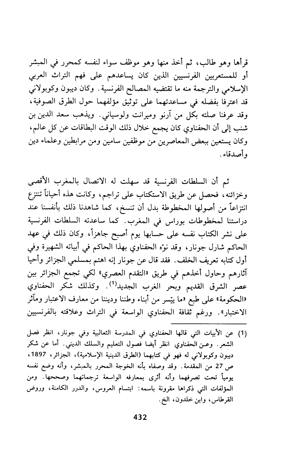 (¬1) عن الأبيات التي قالها الحفناوي في المدرسة الثعالبية وفي جونار، انظر فصل الشعر. وعن الحفناوي انظر أيضا فصول التعليم والسلك الديني. أما عن شكر ديبون وكوبولاني له فهو في كتابهما (الطرق الدينية الإسلامية)، الجزائر، 1897، ص 27 من المقدمة. وقد وصفاه بأنه الخوجة المحرر بالمبشر، وأنه وضع نفسه يوميا تحت تصرفهما وأنه أثرى بمعارفه الواسعة ترجماتهما وصححها. ومن المؤلفات التي ذكراها مقرونة باسمه: ابتسام العروس، والدرر الكامنة، وروض القرطاس، وابن خلدون، الخ.