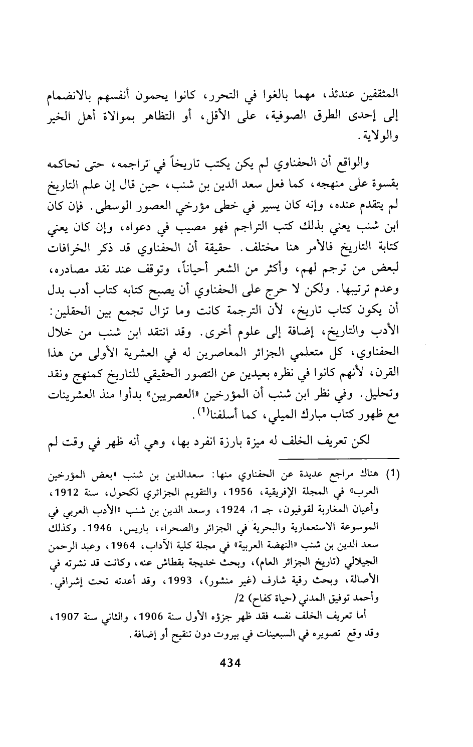 (¬1) هناك مراجع عديدة عن الحفناوي منها: سعد الدين بن شنب (بعض المؤرخين العرب) في المجلة الإفريقية، 1956، والتقويم الجزائري لكحول، سنة 1912، وأعيان المغاربة لقوفيون، ج 1، 1924، وسعد الدين بن شنب (الأدب العربي في الموسوعة الاستعمارية والبحرية في الجزائر والصحراء)، باريس، 1946. وكذلك سعد الدين بن شنب (النهضة العربية) في مجلة كلية الآداب، 1964، وعبد الرحمن الجيلالي (تاريخ الجزائر العام)، وبحث خديجة بقطاش عنه، وكانت قد نشرته في الأصالة، وبحث رقية شارف (غير منشور)، 1993، وقد أعدته تحت إشرافي. وأحمد توفيق المدني (حياة كفاح) 2/.
