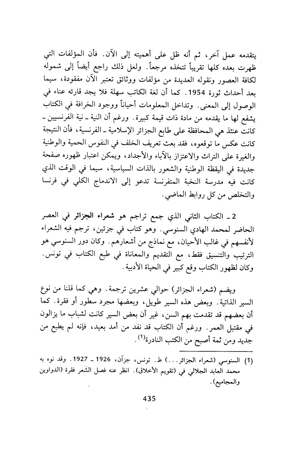 (¬1) السنوسي (شعراء الجزائر ...) ط. تونس، جزآن، 1926 - 1927. وقد نوه به محمد العابد الجلالي في (تقويم الأخلاق). انظر عنه فصل الشعر فقرة (الدواوين والمجاميع).