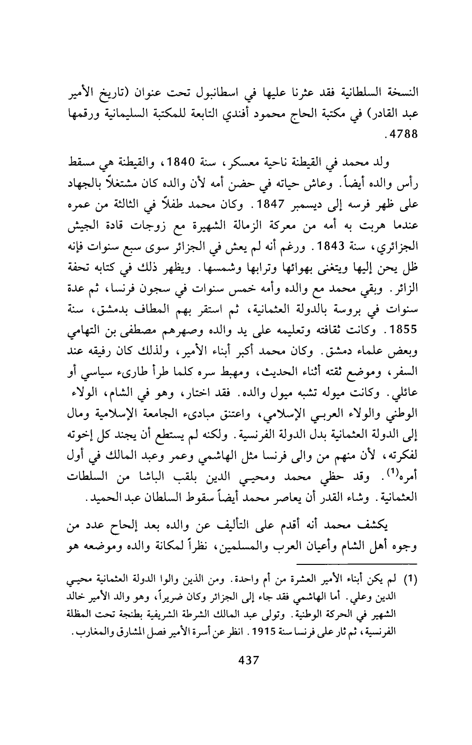 (¬1) لم يكن أبناء الأمير العشرة من أم واحدة. ومن الذين والوا الدولة العثمانية محيي الدين وعلي. أما الهاشمي فقد جاء إلى الجزائر وكان ضريرا، وهو والد الأمير خالد الشهير في الحركة الوطنية. وتولى عبد المالك الشرطة الشريفية بطنجة تحت المظلة الفرنسية، ثم ثار على فرنسا سنة 1915. انظر عن أسرة الأمير فصل المشارق والمغارب.
