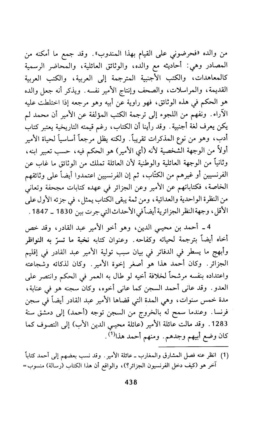 (¬1) انظر عنه فصل المشارق والمغارب - عائلة الأمير. وقد نسب بعضهم إلى أحمد كتابا آخر هو (كيف دخل الفرنسيون الجزائر؟)، والواقع أن هذا الكتاب (رسالة) منسوب =