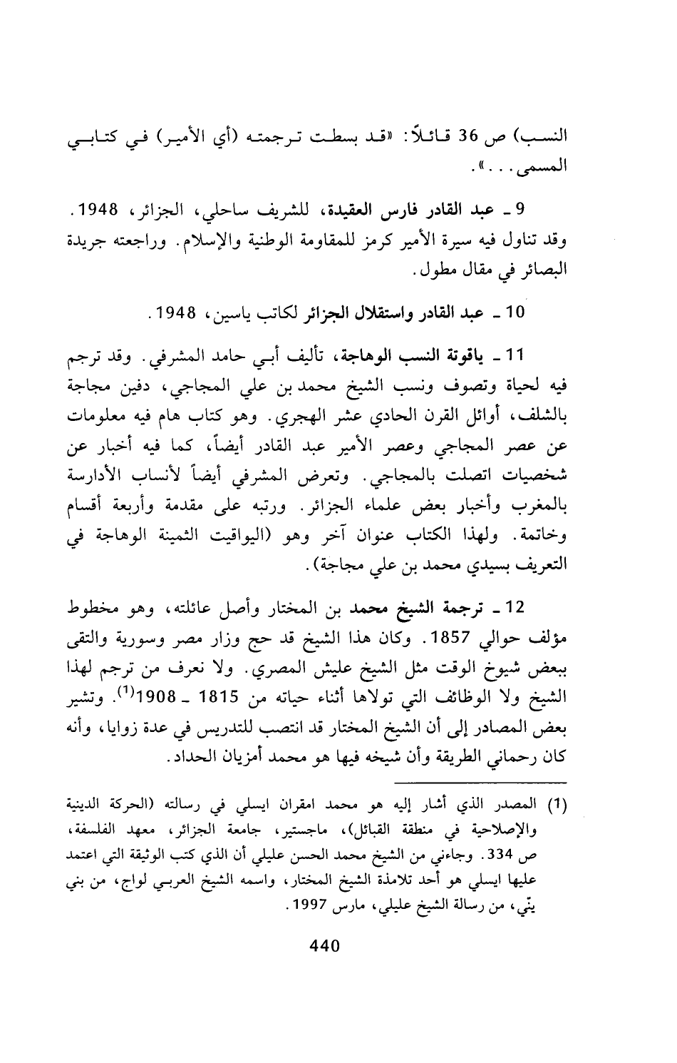 (¬1) المصدر الذي أشار إليه هو محمد امقران ايسلي في رسالته (الحركة الدينية والإصلاحية في منطقة القبائل)، ماجستير، جامعة الجزائر، معهد الفلسفة، ص 334. وجاء في من الشيخ محمد الحسن عليلي أن الذي كتب الوثيقة التي اعتمد عليها ايسلي هو أحد تلامذة الشيخ المختار، واسمه الشيخ العربي لواج، من بني يني، من رسالة الشيخ عليلي، مارس 1997.