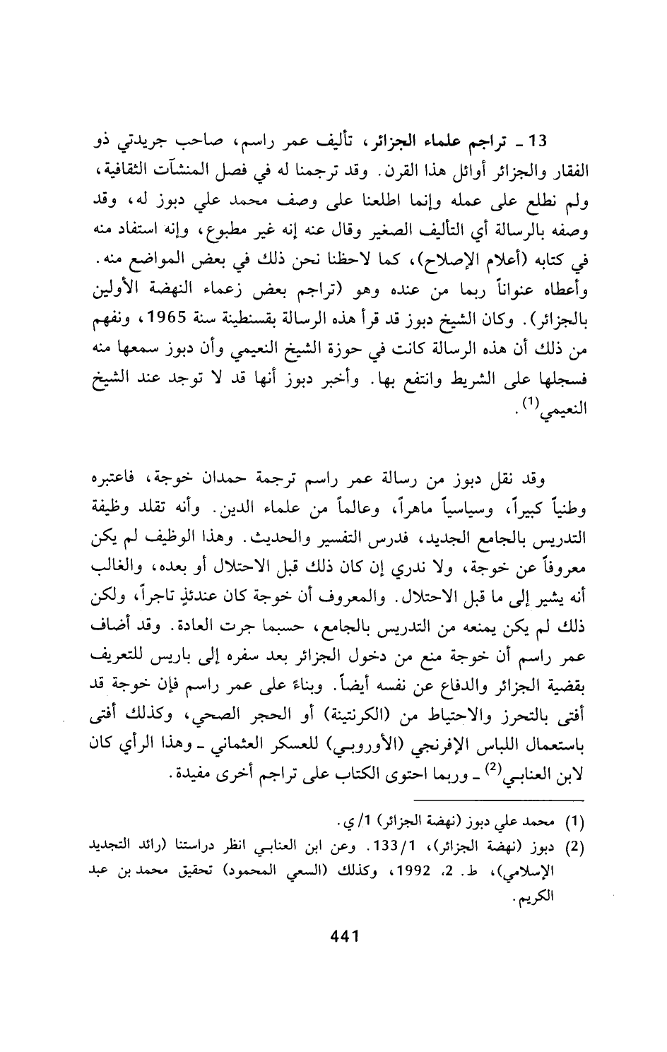 13 - تراجم علماء الجزائر، تأليف عمر راسم، صاحب جريدتي ذو الفقار والجزائر أوائل هذا القرن. وقد ترجمنا له في فصل المنشآت الثقافية، ولم نطلع على عمله وإنما اطلعنا على وصف محمد علي دبوز له، وقد وصفه بالرسالة أي التأليف الصغير وقال عنه إنه غير مطبوع، وإنه استفاد منه في كتابه (أعلام الإصلاح)، كما لاحظنا نحن ذلك في بعض المواضع منه. وأعطاه عنوانا ربما من عنده وهو (تراجم بعض زعماء النهضة الأولين بالجزائر). وكان الشيخ دبوز قد قرأ هذه الرسالة بقسنطينة سنة 1965، ونفهم من ذلك أن هذه الرسالة كانت في حوزة الشيخ النعيمي وأن دبوز سمعها منه فسجلها على الشريط وانتفع بها. وأخبر دبوز أنها قد لا توجد عند الشيخ النعيمي (¬1).