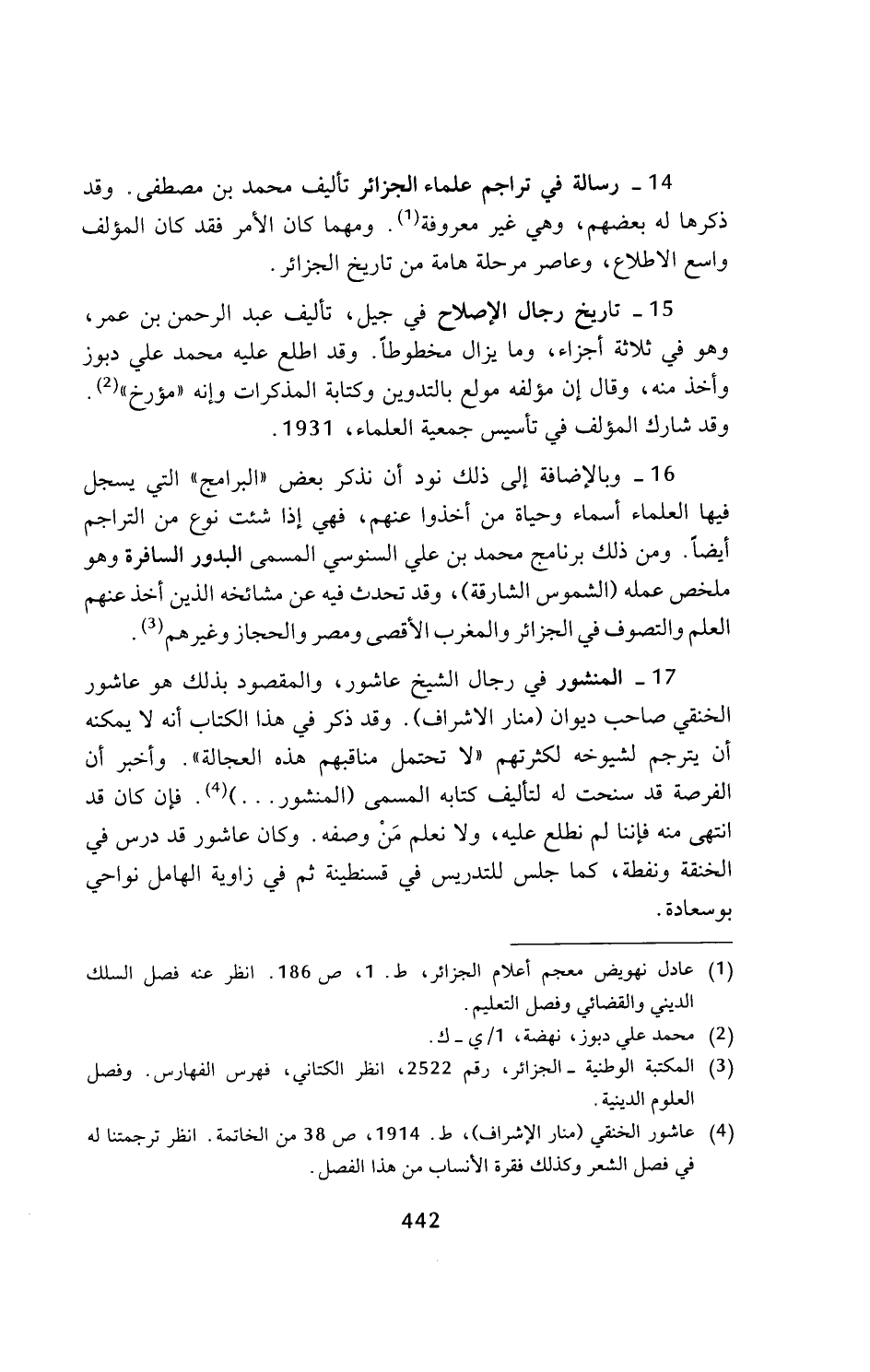 15 - تاريخ رجال الإصلاح في جيل، تأليف عبد الرحمن بن عمر، وهو في ثلاثة أجزاء، وما يزال مخطوطا. وقد اطلع عليه محمد علي دبوز وأخذ منه، وقال إن مؤلفه مولع بالتدوين وكتابة المذكرات وإنه (مؤرخ) (¬2). وقد شارك المؤلف في تأسيس جمعية العلماء، 1931.