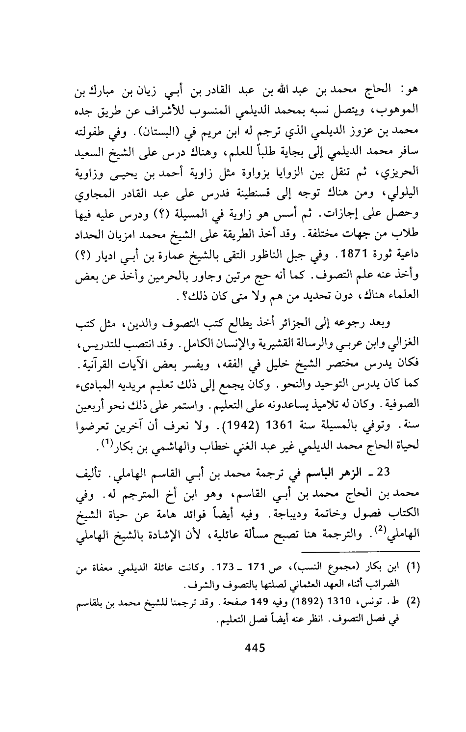 23 - الزهر الباسم في ترجمة محمد بن أبي القاسم الهاملي. تأليف محمد بن الحاج محمد بن أبي القاسم، وهو ابن أخ المترجم له. وفي الكتاب فصول وخاتمة وديباجة. وفيه أيضا فوائد هامة عن حياة الشيخ الهاملي (¬2). والترجمة هنا تصبح مسألة عائلية، لأن الإشادة بالشيخ الهاملي