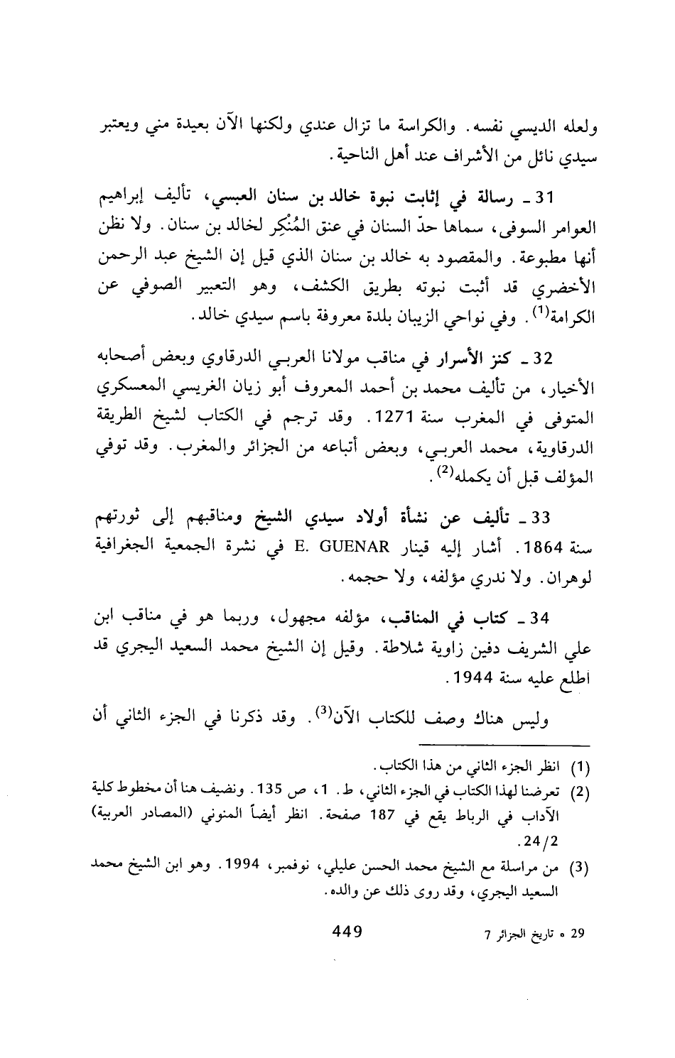 33 - تأليف عن نشأة أولاد سيدي الشيخ ومناقبهم إلى ثورتهم سنة 1864. أشار إليه قينار E. GUENAR في نشرة الجمعية الجغرافية لوهران. ولا ندري مؤلفه، ولا حجمه.