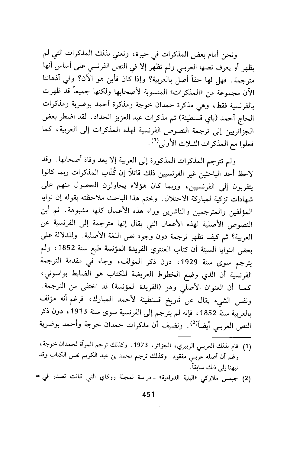 ولم تترجم المذكرات المذكورة إلى العربية إلا بعد وفاة أصحابها. وقد لاحظ أحد الباحثين غير الفرنسيين ذلك قائلا إن كتاب المذكرات ربما كانوا يتقربون إلى الفرنسيين، وربما كان هؤلاء يحاولون الحصول منهم على شهادات تزكية لمباركة الاحتلال. وختم هذا الباحث ملاحظته بقوله إن نوايا المؤلفين والمترجمين والناشرين وراء هذه الأعمال كلها مشبوهة. ثم أين النصوص الأصلية لهذه الأعمال التي يقال إنها مترجمة إلى الفرنسية عن العربية؟ ثم كيف تظهر ترجمة دون وجود نص اللغة الأصلية. وللدلالة على بعض النوايا السيئة أن كتاب العنتري الفريدة المؤنسة طبع سنة 1852، ولم يترجم سوى سنة 1929، دون ذكر المؤلف، وجاء في مقدمة الترجمة الفرنسية أن الذي وضع الخطوط العريضة للكتاب هو الضابط بواسوني، كما أن العنوان الأصلي وهو (الفريدة المؤنسة) قد اختفى من الترجمة. ونفس الشيء يقال عن تاريخ قسنطينة لأحمد المبارك، فرغم أنه مؤلف بالعربية سنة 1852، فإنه لم يترجم إلى الفرنسية سوى سنة 1913، دون ذكر النص العربي أيضا (¬2). ونضيف أن مذكرات حمدان خوجة وأحمد بوضرية
