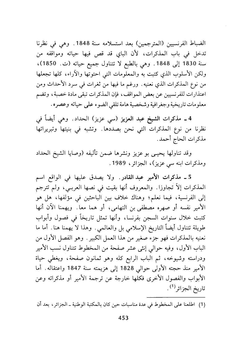 5 - مذكرات الأمير عبد القادر. ولا يصدق عليها في الواقع اسم المذكرات إلا تجاوزا. والمعروف أنها بقيت في نصها العربي، ولم تترجم إلى الفرنسية، فيما نعلم؛ وهناك خلاف بين الباحثين في مؤلفها، هل هو الأمير نفسه أو صهره مصطفى بن التهامى، أو هما معا. ويهمنا الآن أنها كتبت خلال سنوات السجن بفرنسا، وأنها تمثل تاريخا في فصول وأبواب طويلة تتناول أيضا التاريخ الإسلامي بل والعالمي. وهذا لا يهمنا هنا. أما ما نعنيه بالمذكرات فهو جزء صغير من هذا العمل الكبير. وهو الفصل الأول من الباب الأول، وفيه حوالى إثنى عشر صفحة من المخطوط تتناول نسب الأمير ودراسته وشيوخه، ثم الباب الرابع كله وهو ثمانون صفحة، ويغطي حياة الأمير منذ حجته الأولى حوالي 1828 إلى هزيمته سنة 1847 واعتقاله. أما الأبواب والفصول الأخرى فكلها خارجة عن ترجمة الأمير أو مذكراته وعن تاريخ الجزائر (¬1).