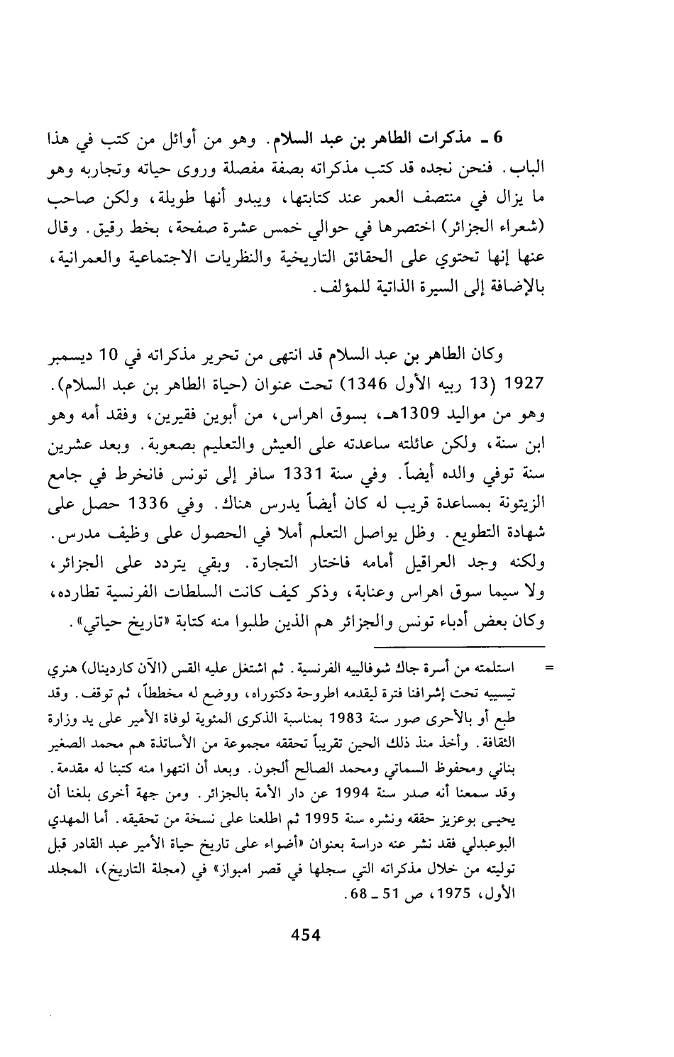 وكان الطاهر بن عبد السلام قد انتهى من تحرير مذكراته في 10 ديسمبر 1927 (13 ربيع الأول 1346) تحت عنوان (حياة الطاهر بن عبد السلام). وهو من مواليد 1309 هـ، بسوق اهراس، من أبوين فقيرين، وفقد أمه وهو ابن سنة، ولكن عائلته ساعدته على العيش والتعليم بصعوبة. وبعد عشرين سنة توفي والده أيضا. وفي سنة 1331 سافر إلى تونس فانخرط في جامع الزيتونة بمساعدة قريب له كان أيضا يدرس هناك. وفي 1336 حصل على شهادة التطويع. وظل يواصل التعلم أملا في الحصول على وظيف مدرس. ولكنه وجد العراقيل أمامه فاختار التجارة. وبقي يتردد على الجزائر، ولا سيما سوق اهراس وعنابة، وذكر كيف كانت السلطات الفرنسية تطارده، وكان بعض أدباء تونس والجزائر هم الذين طلبوا منه كتابة (تاريخ حياتي).