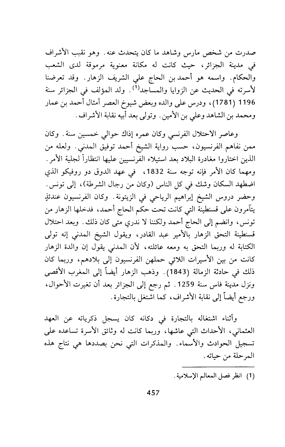 صدرت من شخص مارس وشاهد ما كان يتحدث عنه. وهو نقيب الأشراف في مدينة الجزائر، حيث كانت له مكانة معنوية مرموقة لدى الشعب والحكام. واسمه هو أحمد بن الحاج علي الشريف الزهار. وقد تعرضنا لأسرته في الحديث عن الزوايا والمساجد (¬1). ولد المؤلف في الجزائر سنة 1196 (1781)، ودرس على والده وبعض شيوخ العصر أمثال أحمد بن عمار ومحمد بن الشاهد وعلي بن الأمين. وتولى بعد أبيه نقابة الأشراف.