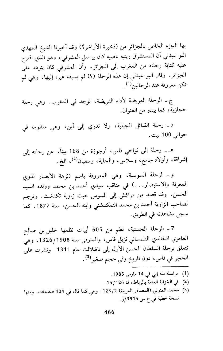 7 - الرحلة الحسنية، نظم من 605 أبيات نظمها خليل بن صالح العامري الخالدي التلمساني نزيل فاس، والمتوفى سنة 1908/ 1326، وهي تتعلق برحلة السلطان الحسن الأول إلى تافيلالت عام 1311. ونشرت على الحجر في فاس، دون تاريخ وفي حجم صغير (¬3).