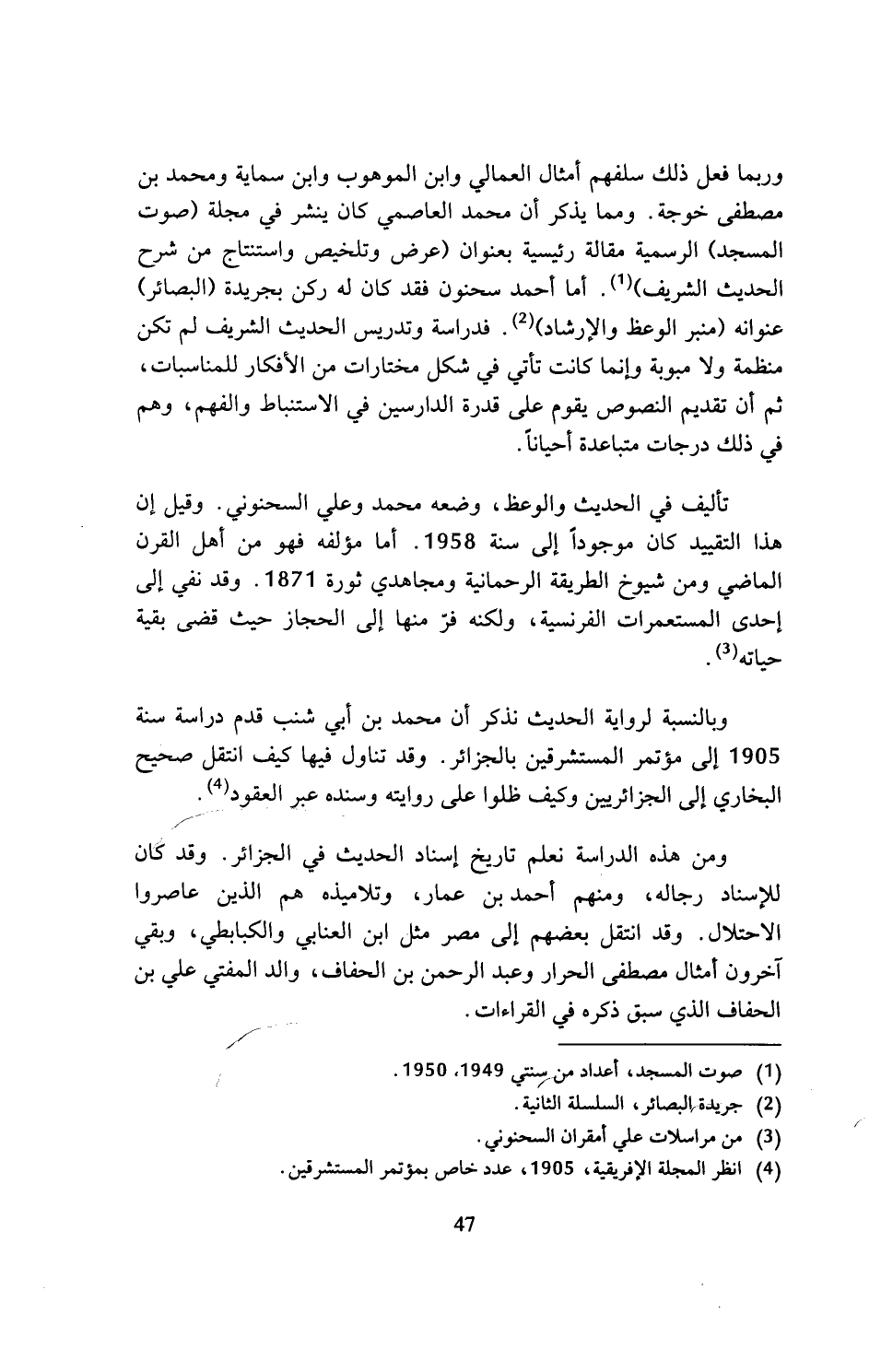 وربما فعل ذلك سلفهم أمثال العمالي وابن الموهوب وابن سماية ومحمد بن مصطفى خوجة. ومما يذكر أن محمد العاصمي كان ينشر في مجلة (صوت المسجد) الرسمية مقالة رئيسية بعنوان (عرض وتلخيص واستنتاج من شرح الحديث الشريف) (¬1). أما أحمد سحنون فقد كان له ركن بجريدة (البصائر) عنوانه (منبر الوعظ والإرشاد) (¬2). فدراسة وتدريس الحديث الشريف لم تكن منظمة ولا مبوبة وإنما كانت تأتي في شكل مختارات من الأفكار للمناسبات، ثم أن تقديم النصوص يقوم على قدرة الدارسين في الاستنباط والفهم، وهم في ذلك درجات متباعدة أحيانا.