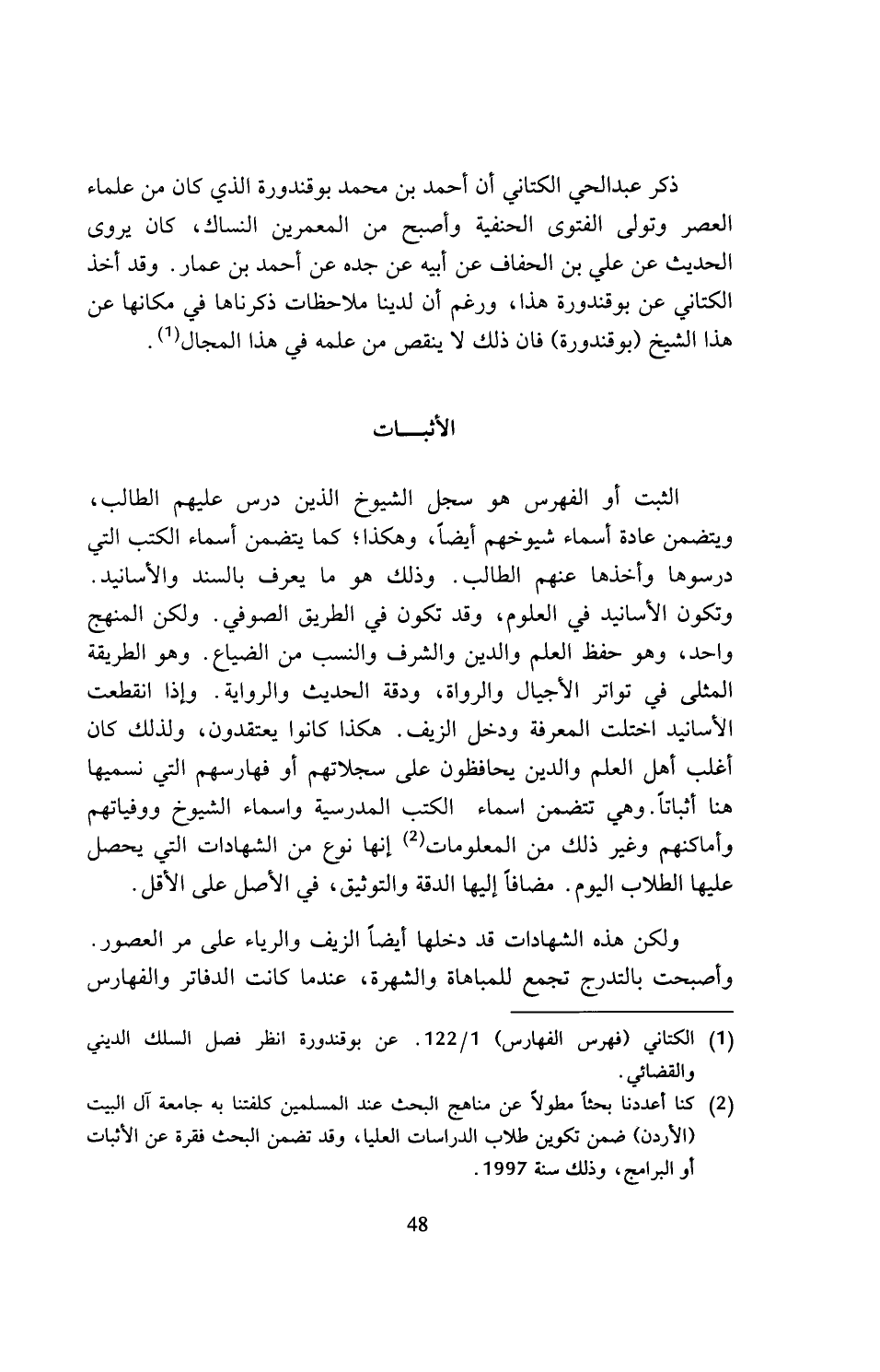 الثبت أو الفهرس هو سجل الشيوخ الذين درس عليهم الطالب، ويتضمن عادة أسماء شيوخهم أيضا، وهكذا؛ كما يتضمن أسماء الكتب التي درسوها وأخذها عنهم الطالب. وذلك هو ما يعرف بالسند والأسانيد. وتكون الأسانيد في العلوم، وقد تكون في الطريق الصوفي. ولكن المنهج واحد، وهو حفظ العلم والدين والشرف والنسب من الضياع. وهو الطريقة المثلى في تواتر الأجيال والرواة، ودقة الحديث والرواية. وإذا انقطعت الأسانيد اختلت المعرفة ودخل الزيف. هكذا كانوا يعتقدون، ولذلك كان أغلب أهل العلم والدين يحافظون على سجلاتهم أو فهارسهم التي نسميها هنا أثباتا. وهي تتضمن اسماء الكتب المدرسية واسماء الشيوخ ووفياتهم وأماكنهم وغير ذلك من المعلومات (¬2) إنها نوع من الشهادات التي يحصل عليها الطلاب اليوم. مضافا إليها الدقة والتوثيق، في الأصل على الأقل.